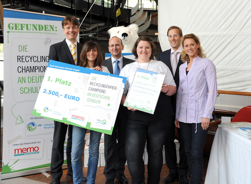 Ende April fand der bundesweite Ideenwettbewerb für mehr Recyclingpapier an Deutschlands Schulen mit der Preisverleihung in Berlin seinen Höhepunkt und Abschluss. Über 500 Schülerinnen und Schüler hatten sich mit ihren Projektteams für den Titel »Recyclingpapier-Champions« beworben. Den ersten Preis erhielt die Umweltgruppe der Rolf-Dircksen-Schule aus Enger (Nordrhein-Westfalen) für ihren umfassenden und langfristig angelegten Aktionsplan, der das Thema Recyclingpapier optimal in den Schulalltag integriert.