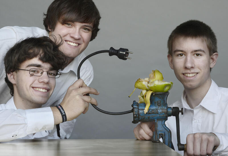Neue Nutzungsmöglichkeiten für erneuerbare Energien bilden den Mittelpunkt zweier »Jugend forscht«-Arbeiten, die mit dem DBU-Sonderpreis »Umwelttechnik« 2012 in Erfurt ausgezeichnet wurden. Die 18-jährigen Andre Krause, Frank Kühmstedt und Sebastian Wendt vom Angergymnasium in Jena (Bild) erhielten für die Miniaturisierung einer Biogasanlage den mit 1.000 Euro dotierten Sonderpreis der DBU. Mit einer selbst gebauten Biogasanlage beweisen sie, dass es gute Alternativen zu fossilen Energieträgern gibt.