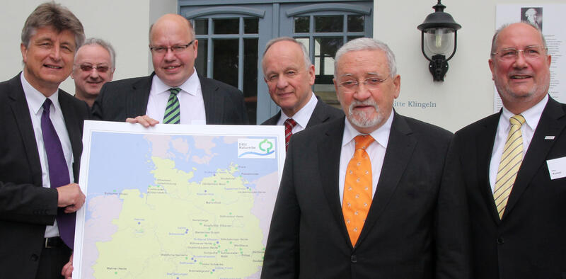 Mit ihren Unterschriften besiegelten Bundesumweltminister Peter Altmaier (3. v. l.), das Vorstandsmitglied der Bundesanstalt für Immobilienaufgaben (BImA), Axel Kunze (rechts), und der Vorsitzende des Kuratoriums der Deutschen Bundesstiftung Umwelt (DBU), Hubert Weinzierl (2. v. r.), Ende Mai den unentgeltlichen Übertrag weiterer 16 000 Hektar wertvoller Naturschutzflächen vom Bund auf die Deutsche Bundesstiftung Umwelt (DBU).