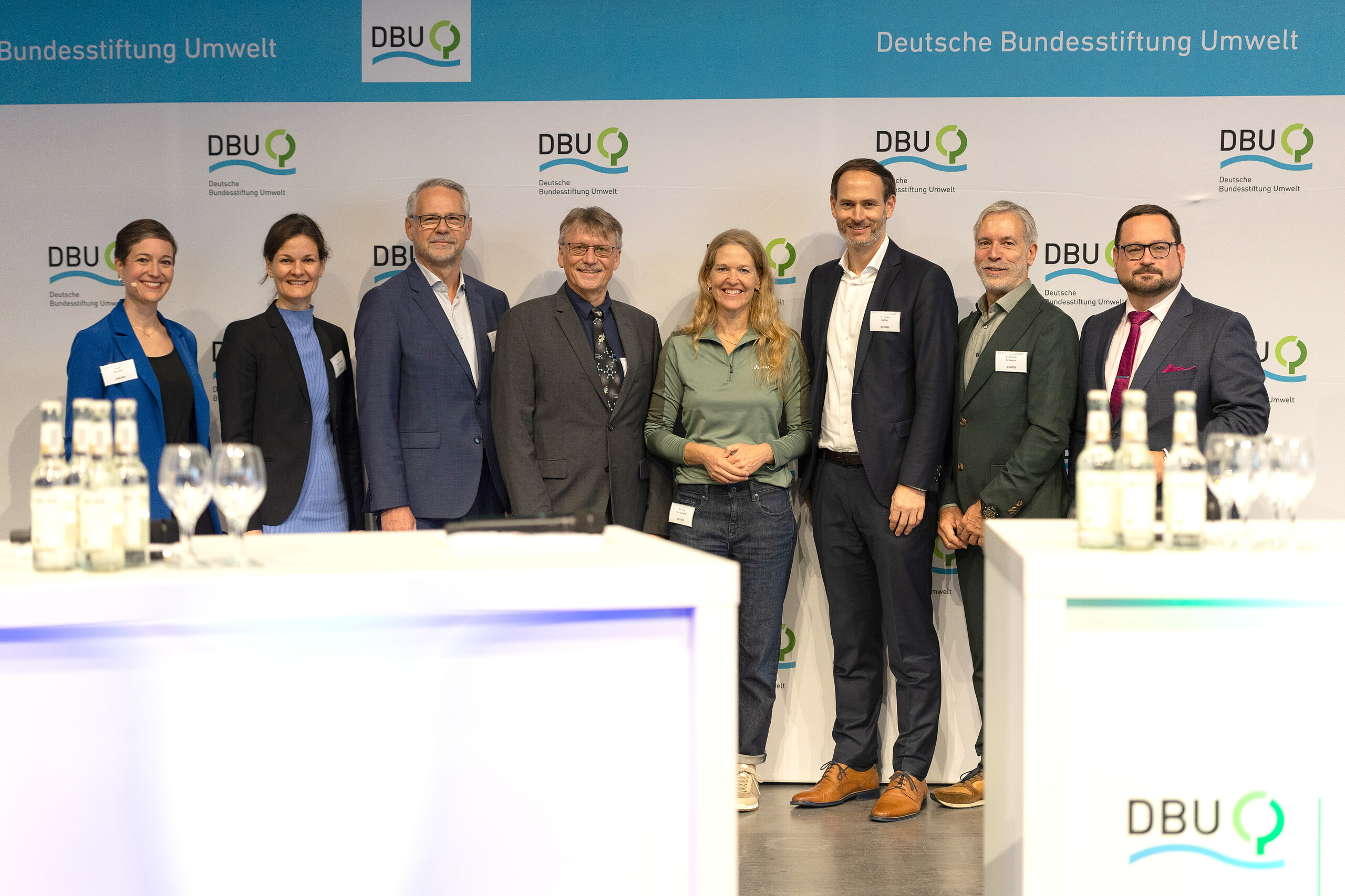 Startklar für das Symposium zum Deutschen Umweltpreis (von links): Moderatorin Jana Münkel, Silke Düwel-Rieth, WWF Deutschland, Dr. Ralf Lütz, BNP Paribas S.A., Georg Hoffmann, Ritter Sport, Dr. Antje von Dewitz, VAUDE, Dr. Tobias Raffel, Senckenberg Gesellschaft für Naturforschung, Dr. Christof Schenck, Zoologische Gesellschaft Frankfurt, und DBU-Generalsekretär Alexander Bonde. Foto: Christopher Waltermann/DBU