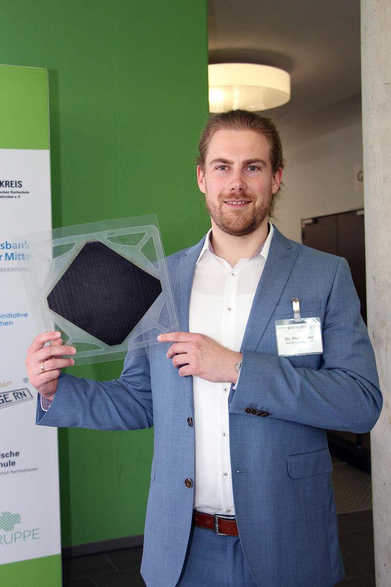 Die Westfälische Hochschule zeichnet regelmäßig ihre besten Gelsenkirchener Absolventinnen und Absolventen im Beisein von Wirtschaftsvertretern aus. Der ehemalige DBU-Promotionsstipendiat Dr. Pit Yannik Podleschny erhielt im Rahmen dieser Auszeichnung am 06.05.2022 den „Preis für Mensch und Umwelt in der Region“ der Abfallentsorgungsgesellschaft Ruhr (AGR). Er untersuchte, wie man in Polymerelektrolytmembran-Brennstoffzellen die Verwendung des Metalls Platin als Katalysator reduzieren kann.