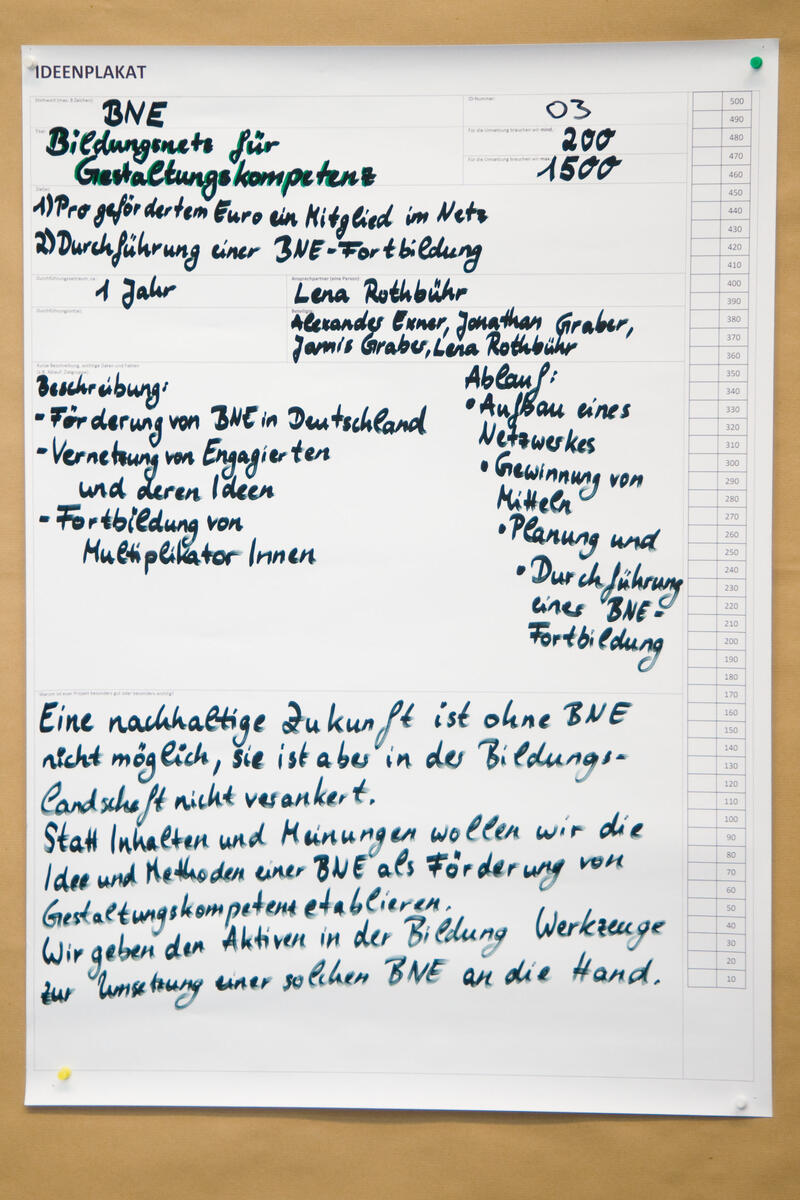 Dazu sollen innerhalb eines Jahres 270 Multiplikatoren einer BNE über das Projekt miteinander vernetzt werden. Außerdem soll innerhalb dieses Zeitraums eine Fortbildung zu der Idee und den Methoden von BNE durchgeführt werden. Um diese Ziele zu erreichen, wird im Rahmen des Projektes ein Blog eingerichtet werden, über den sich interessierte Personen zu einem Mailverteiler anmelden können. Über andere Netzwerke wird für das Netzwerk und die angebotene BNE -Fortbildung geworben, um die Resonanz des Projektes zu verstärken. Darüber hinaus werden über weitere Projektförderungen andere Fortbildungsangebote geschaffen, wodurch die Resonanzwirkung noch weiter zu verstärken. Einordnung in den Kontext der Nachhaltigkeit: Bildung für nachhaltige Entwicklung zielt auf einen mentalen Wandel und die „große Transformation“ der Gesellschaft ab. Umwelt- und Naturschutz können nur dann langfristig erfolgreich sein, wenn ein Umdenken in der Bevölkerung stattfindet. Während andere Maßnahmen das Konsumverhalten der Menschen beeinflussen kann, ist nur über die Verankerung einer BNE zur Entfaltung von Gestaltungskompetenz möglich, ein Bewusstsein für die Auswirkungen menschlichen Handelns zu schaffen. Nur so kann eine große Transformation hin zur Nachhaltigkeit gelingen.
