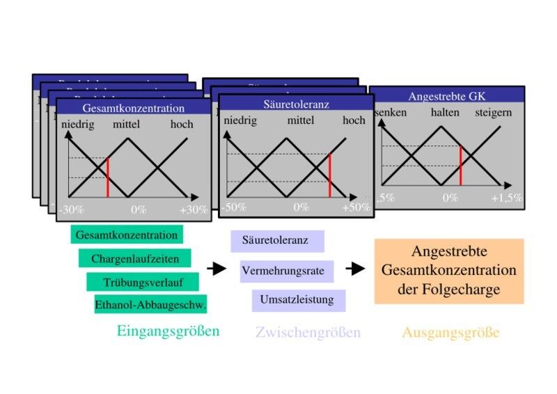 Literaturdaten und Expertenwissen, d.h. das unpublizierte Know-how in den Köpfen erfahrener Anlagenführer, wurden in ein sogenanntes Fuzzy-Logic-Regelsystem integriert. Ein solcher Ansatz bot sich deshalb an, weil die gesammelten Experteninformationen zur Prozesssteuerung überwiegend qualitativen Charakter hatten. Nach Prüfung diverser Messgrößen und Sonden (pH, Gelöstsauerstoff, Redoxpotenzial, Trübung, Leitfähigkeit) hinsichtlich ihrer Robustheit und Aussagekraft bewährte sich die Erfassung der Trübung als zusätzliche Eingangsinformation des virtuelle Essigmeisters zur Erfassung des biologischen Prozesszustands: Ansteigende Trübung verrät, dass die Essigsäurebakterien sich vermehren, abnehmende Trübung bedeutet, dass mehr Bakterien sterben, als durch Zellteilung neue entstehen. In Verbindung mit anderen Daten beurteilt der virtuelle Essigmeister, ob die Acetobacter-Zellen noch weiter belastbar sind und steigert schlussendlich die Säuretoleranz, und damit die erzielbare Produktkonzentration und die volumetrische Produktivität, durch das fuzzy-gestützte, situative Management des Säurestresses.