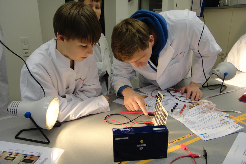 Die Schülerinnen und Schüler lernen die physikalischen Vorgänge in der Solarzelle kennen und können Reihen- und Parallelschaltung ausprobieren.
