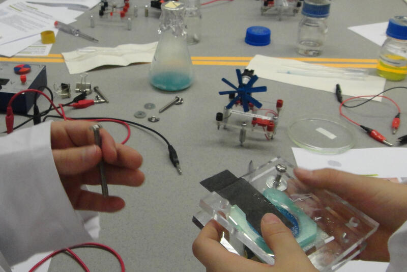 Die Schülerinnen und Schüler bauen eine Brennstoffzelle, die mit Hilfe von Hefezellen und einer Redoxreaktion betrieben wird.