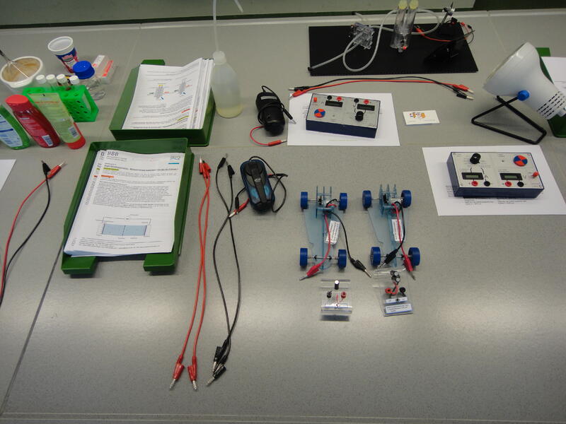 Die Lernenden stellen mit Hilfe von Elektrolyse selbst Wasserstoff her und betreiben damit eine Brennstoffzelle. Hier lernen sie neben den physikalischen Vorgängen, dass Wasserstoff bei sachgemäßem Umgang ungefährlich ist und als Energiespeicher dienen kann.