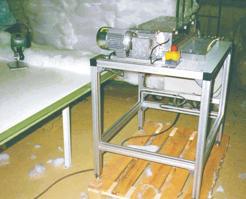 - Eine Anlage zur Aufbereitung der Randstreifen an Vielnadelmaschinen. Hier erfolgt eine Trennung in Füll- und Decklagenmaterial mit anschließender Rückführung des Füllmaterials in den Vliesbildungsprozess und Sammlung der Decklagenstreifen. Diese Lösung kann in Kopplung zum kontinuierlichen Nähprozess betrieben werden.