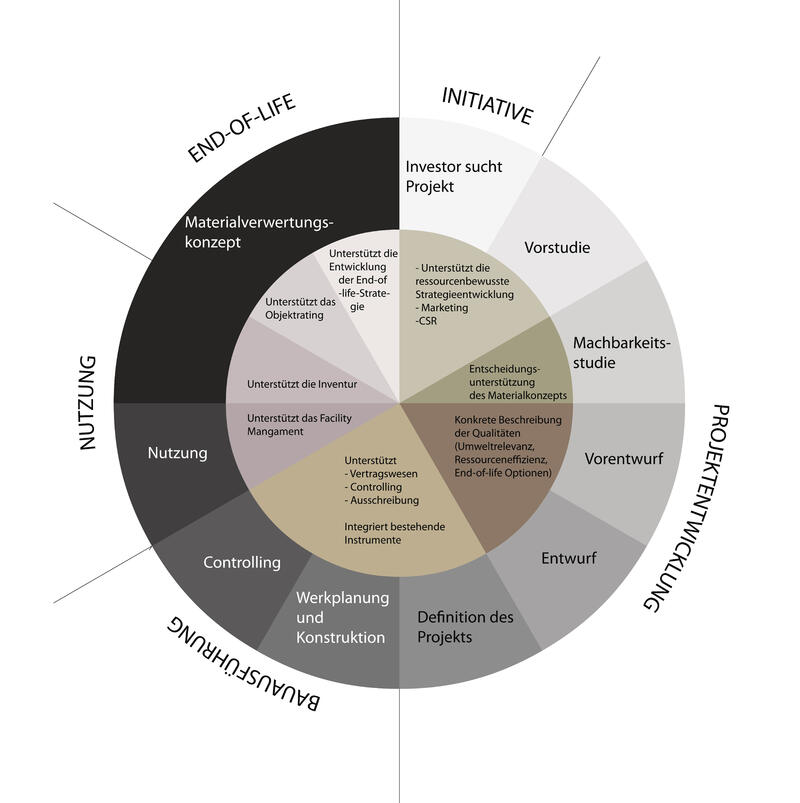 Projektentwicklungen finden immer häufiger in Städten statt, wo vorhandene Bausubstanz weiterverwendet oder beseitigt werden muss und die Unsicherheit über enthaltene Materialien und Stoffe sehr groß ist. Insbesondere zu Beginn eines Projektes kann der Stoffpass aufzeigen, wie sich Ressourcen und Materialien effizient verwenden lassen (resource performance) und wie ein Stoffstrommanagement im Lebenszyklus umsetzbar ist (life cycle material flow management). Entwickelt und evaluiert wird der Pass anhand von Projekten des Immobilienunternehmens Bayerische Hausbau GmbH & Co. KG (München). Um Indikatoren und Messgrößen zu ermitteln, werden alle Stoff-mengen erfasst und sogenannte Risikokonstruktionen bestimmt.