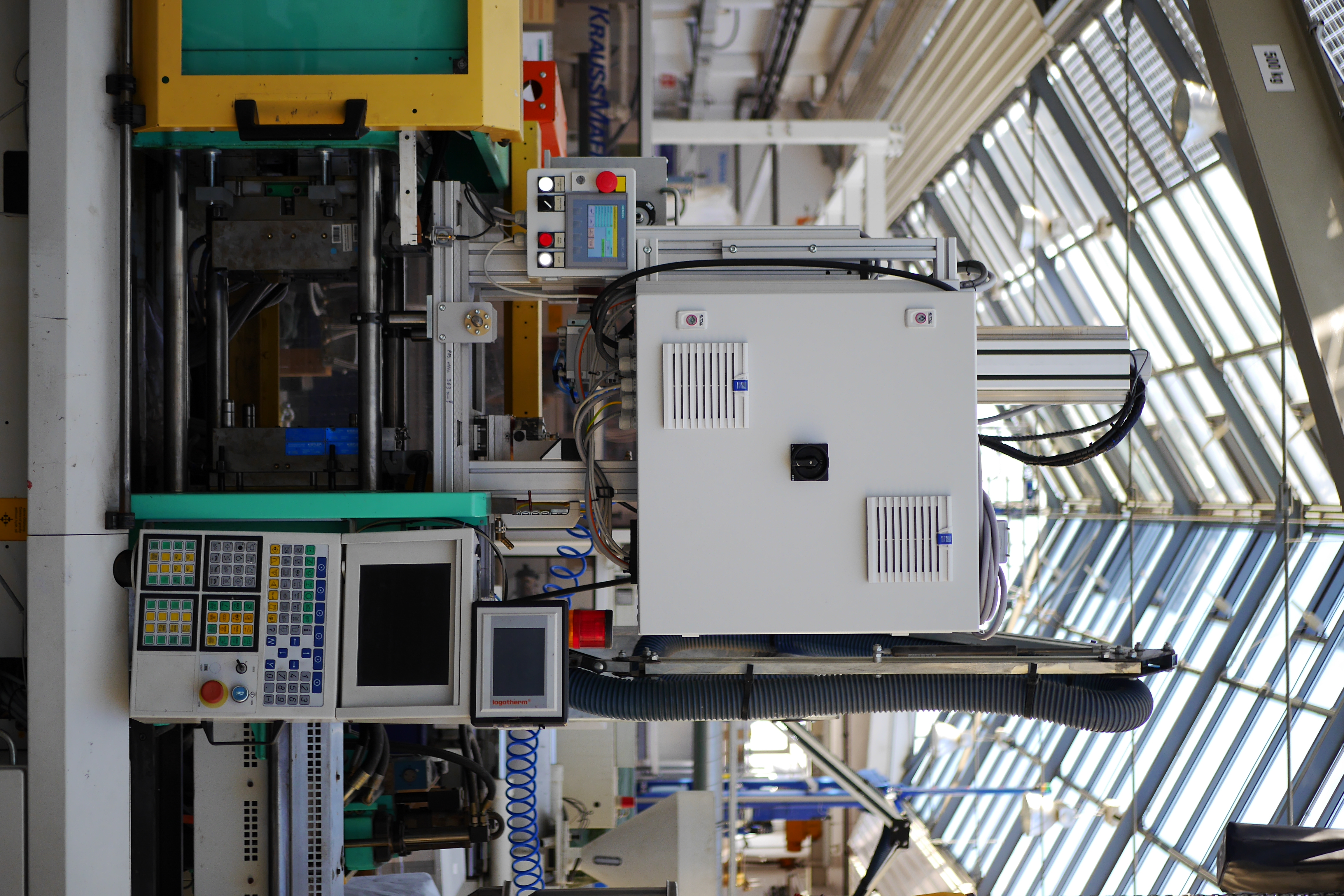 Für die Verarbeitung elektr. leitfähiger Substanzen in der geplanten Prozessroute war die Entwicklung einer neuartigen Anlagentechnik notwendig. Diese besteht aus einer Tampondruckanlage, welche auf die Spritzgussmaschine als Modul aufgesetzt wird und bei geöffnetem Spritzgusswerkzeug das Schaltbild auf die Werkzeugwand applizieren kann. Manuelle Vorversuche mit thermoplastischem Kunststoff hatten zudem gezeigt, dass es bei Drucksubstanzen auf metallischer Basis aufgrund der werkstofflichen Zusammensetzung notwendig sein kann, das auf der Werkzeugwand applizierte Schaltungsbild zu trocknen. Dies ermöglicht es, einen günstigen thermo-rheologischen Zustand beim Einspritzen der Kunststoffschmelze gezielt einzustellen. Hierfür sollte die Tampondruckanlage u.a. über eine automatisierte Trocknungsanlage verfügen. Nach Auslegung und Konstruktion der Komponenten, welche zur Funktionserfüllung gemäß Lastenheft benötigt wurden, mussten Einzelteillisten erstellt und entsprechend beschafft werden. Im weiteren Verlauf wurden zunächst die Einzelkomponenten vormontiert und dann zur Gesamtbaugruppe zusammengesetzt. Nach Implementierung der Steuerung wurden alle Verfahrbewegungen und Funktionen gemäß Lastenheft sowohl als Einzelfunktion als auch als (Halb)automatikablauf überprüft.