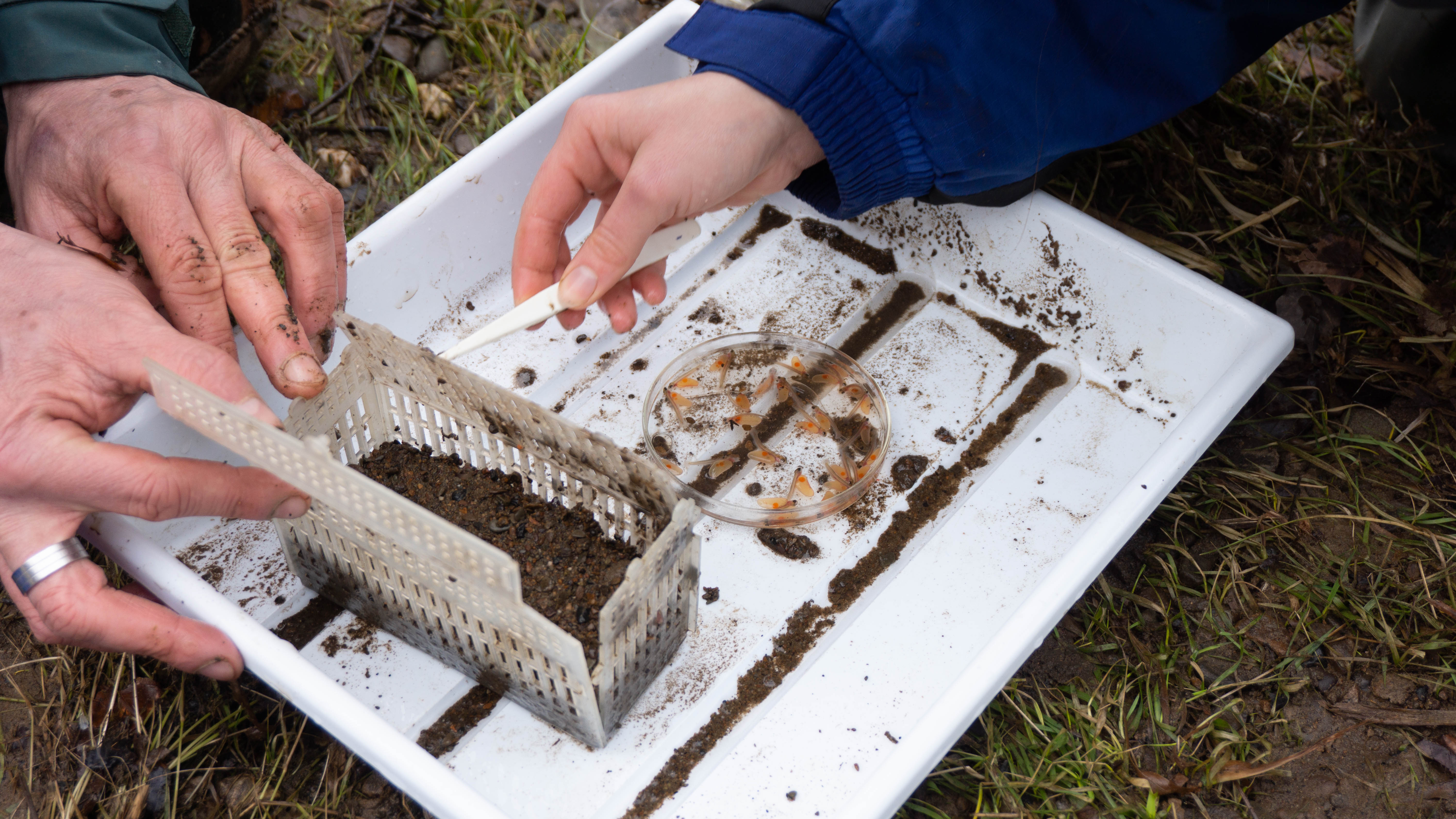 Die Reproduktionsbedingungen im Interstitial potenzieller Lachslaichhabitate werden über das Einbringen von Lachseiern im Augenpunktstadium und deren Schlupferfolg geprüft. Dafür werden Lachseier in Brutröhrchen in der Gewässersohle vergraben und nach dem Schlupf auf ihre Überlebensrate begutachtet.