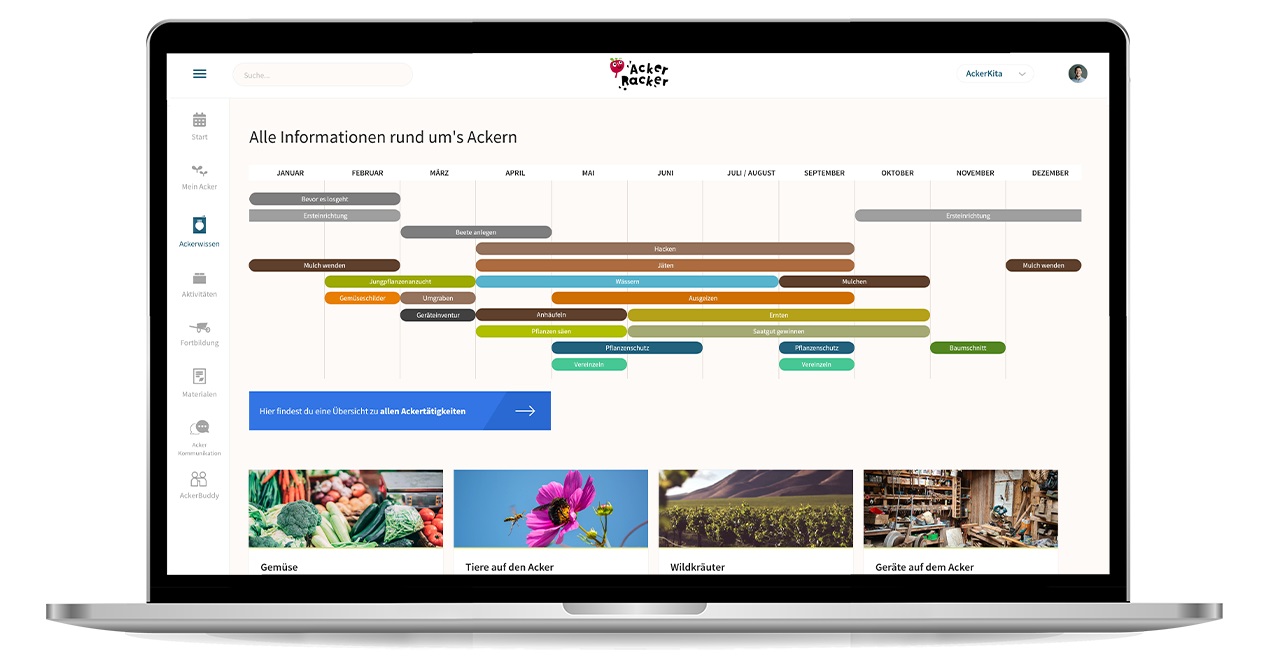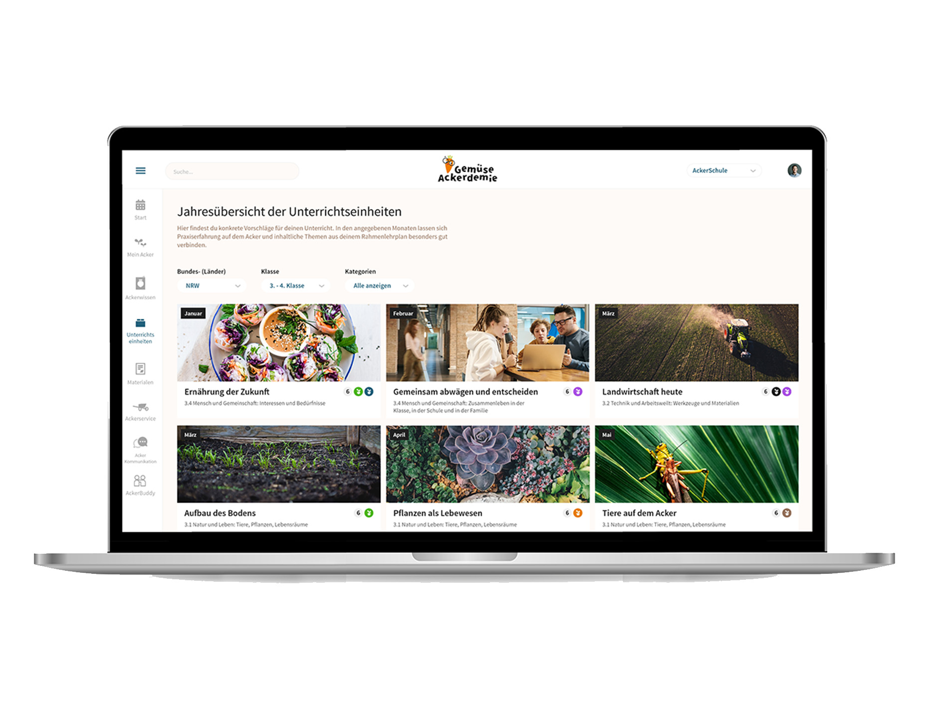 Jede teilnehmende Bildungseinrichtung hat einen Schulgarten auf dem Schulgelände oder in der Nähe, welcher identisch digital abgebildet wird und die Grundlage für individualisierte, standortbezogene und bedarfsgerechte Informationen darstellt. Auf der Startseite der digitalen Lernplattform finden Pädagog*innen eine aktuelle Übersicht und Hinweise zu anstehenden Ackertätigkeiten sowie einen individuell hinterlegten Anbauplan für den eigenen Acker. Außerdem stehen detaillierte (Video-) Anleitungen zur Ackerpflege und Begleit- und Informationsmaterialien für ein wirkungsvolles Ackern mit den Kindern zur Verfügung. Pädagog*innen haben Zugriff zu kuratierten Unterrichtseinheiten für die 3.- 6. Klassenstufen, die direkt an die Rahmenlehrpläne der 16 deutschen Bundesländer anknüpfen. Jede Unterrichtseinheit beinhaltet zwischen zehn und fünfzehn Übungen, inklusive Lernzielen, dazugehörigen Materialien und umfangreichen Hintergrundinformationen für die Lehrkräfte.