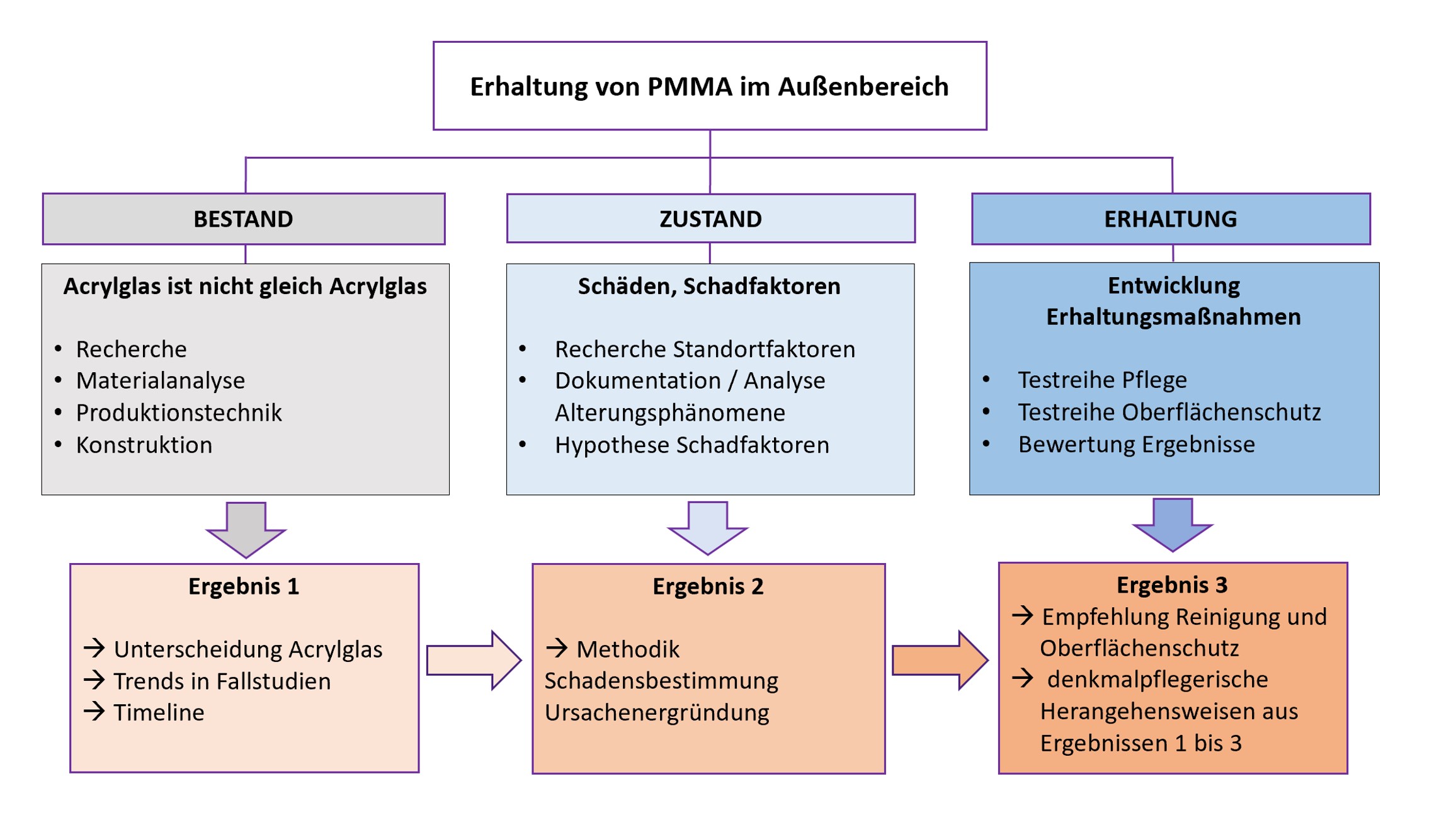 Die Entwicklung von substanzerhaltenden Maßnahmen für historisches Acrylglas setzt zwei Stufen voraus. Auf die Erfassung sichtbarer Alterungsphänomene, deren Aussehen und Schweregrad, folgt die Identifikation von Abbaumechanismen und deren ursächlichen Schadfaktoren. Die Schadensursachen zeigen auf, wo mindernd eingegriffen werden sollte und welches die häufigsten und schädlichsten Ursachen sind, die adressiert werden sollten. Der größte Anteil der erhaltenden Maßnahmen sollten nicht invasiv sein, bspw. durch Monitoring. Minimal invasive Maßnahmen bilden den kleineren Teil und stark invasive Maßnahmen sollten den geringsten Raum einnehmen.