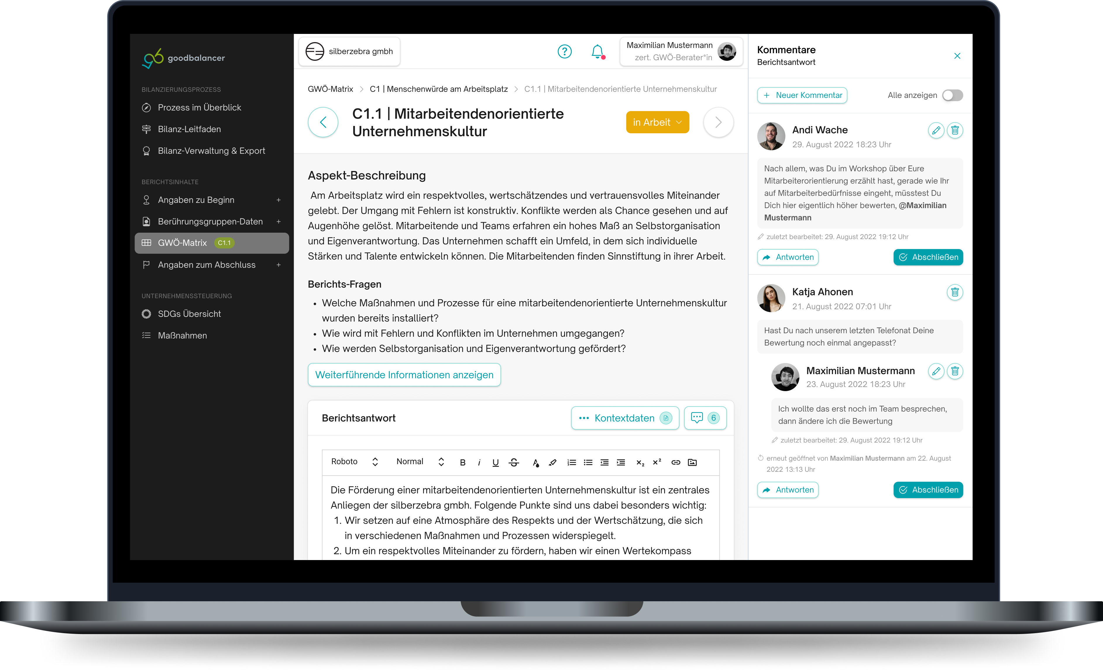 Eine Aufwandsreduktion von bis zu 40%, vereinfachte Erfassung der Inhalte, mehr Übersichtlichkeit und Beherrschbarkeit des langen Berichtsprozesses – diese Punkte heben Kund*innen als Vorteile von goodbalancer hervor. Dadurch hat sich die Software zu einem professionellen Werkzeug entwickelt, das bisher von rund 200 Unternehmen eingesetzt wurde. Dazu gehören auch Großunternehmen mit bis zu 2.500 Mitarbeitenden, die besonders Effizienzgewinne durch die Prozessunterstützung und Kollaborations-Möglichkeiten im Team schätzen. Zahlreiche KMU mit bis zu 500 Mitarbeitenden haben sich durch goodbalancer überhaupt erst für den Schritt zur Gemeinwohl-Bilanzierung entschieden. Ergebnisse werden auf der offiziellen GWÖ-Plattform https://audit.ecogood.org/firmenauskunft-fvz/ veröffentlicht.