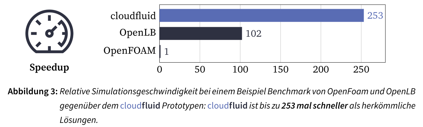 Die aus diesem Testfall resultierenden relativen Simulationsgeschwindigkeiten sind in Abbildung 3 aufgetragen: cloudfluid ist bis zu 253-mal schneller.