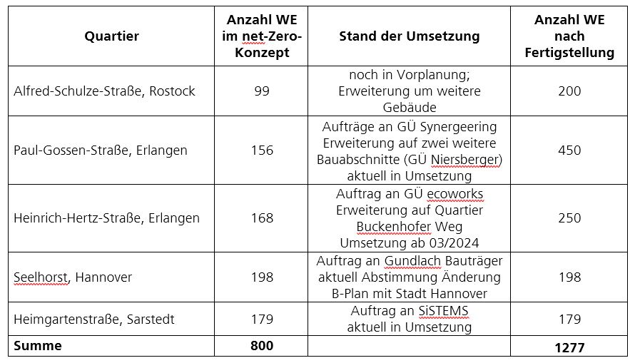 Im Rahmen des Vorhabens „net-Zero-Konzepte“ wurde für 800 Wohneinheiten in fünf Quartieren mit sehr unterschiedlichen Ausgangsvoraussetzungen die Erreichbarkeit eines klimaneutralen „net-Zero-Quartiers“ geprüft und anhand eines Umsetzungsplans die konkrete Vorgehensweise mit den notwendigen technischen Standards beschrieben. Einen Schlüssel für die Erreichung nimmt dabei die serielle Sanierung mit vorgefertigten Gebäudelementen mit Passivhausqualität und Haustechnikelementen auf Basis von Wärmepum-pentechnik unter Nutzung des kompletten vorhandenen PV-Potenzials im jeweiligen Quartier ein.