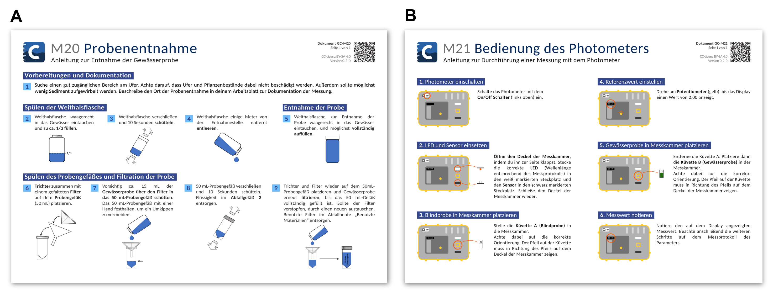 Ein Ziel des Projekts war es, Vorschriften zur photometrischen Bestimmung des pH-Wertes, des Phosphat-, Nitrat-, Nitrit-, Ammonium-, Sauerstoff- und Chlorophyll-a-Gehalts von Gewässerproben auszuarbeiten. Im Laufe des Projektes hat sich es aufgrund der Rückmeldung der beteiligten Lehrkräfte als vorteilhaft erwiesen, den Bach- und den Trophie-Index zur Ermittlung des Gewässerzustands zu verwenden. Bei der Entwicklung der Versuchsprotokolle wurden wissenschaftlich verwendete Protokolle angepasst, Chemikalien, wenn nötig ausgetauscht und fachliche Inhalte didaktisch reduziert. Zur besseren Verständlichkeit für die Schüler:innen wurden die Versuchsvorschriften in Form bebilderter Anleitung gestaltet (Abbildung 2). Außerdem wurden Unterrichtsmaterialien sowie eine Handreichung für Lehrkräfte mit anpassbaren Unterrichtsreihen für die Fächer Biologie und Chemie erstellt.