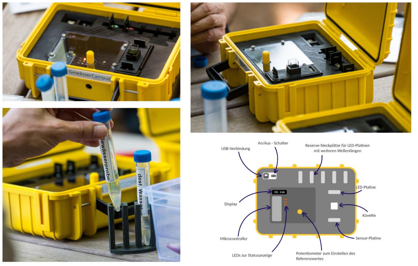 Im Verlauf des Projekts “ECOLAB - Photometrie im Sinne der Umweltbildung verstehen und anwenden”, umbenannt in "GewässerCampus", wurde ein Citizen Science-Werkzeugkasten (Abbildung 1) entwickelt, mit dem eine Untersuchung der ökologischen Gewässergüte im MINT-Unterricht ermöglicht wird. Die Projektergebnisse umfassen einfach durchzuführende Laborprotokolle, mit deren Hilfe, in Kombination mit dem didaktisch aufbereiteten und tragbaren Photometer, direkt am Untersuchungsort photometrische Experimente zur Quantifizierung der für den chemischen Gewässerzustand charakteristischen Parameter pH-Wert, Phosphat, Nitrat, Nitrit, Ammonium, Sulfat, Gelöstsauerstoff- und Chlorophyll-a-Gehalt erfolgen kann. Ergänzend dazu vermitteln die begleitenden Unterrichtsmaterialien die wichtigsten theoretischen Hintergründe sowie zu den verwendeten Nachweisreaktionen. Die erarbeiteten Unterrichtsmaterialien beinhalten auch leicht verständliche, bebilderte Anleitungen zur Durchführung der Experimente und eine Erklärung und Anleitung für die Berechnung chemischer Gewässergüteindizes: den BACH-Index (Fließgewässer) und den Trophie-Index (stehender Gewässer). Die chemische Gewässergüte wird dabei auch im Kontext der Gewässerstrukturgüte und der biologischen Gewässergüte betrachtet, deren Bestimmung ebenfalls unterstützt wird. Alle entwickelten Materialien sind öffentlich einsehbar und können von interessierten Lehrkräften im Regelunterricht als auch in extracurricularen Projekten eingesetzt werden.