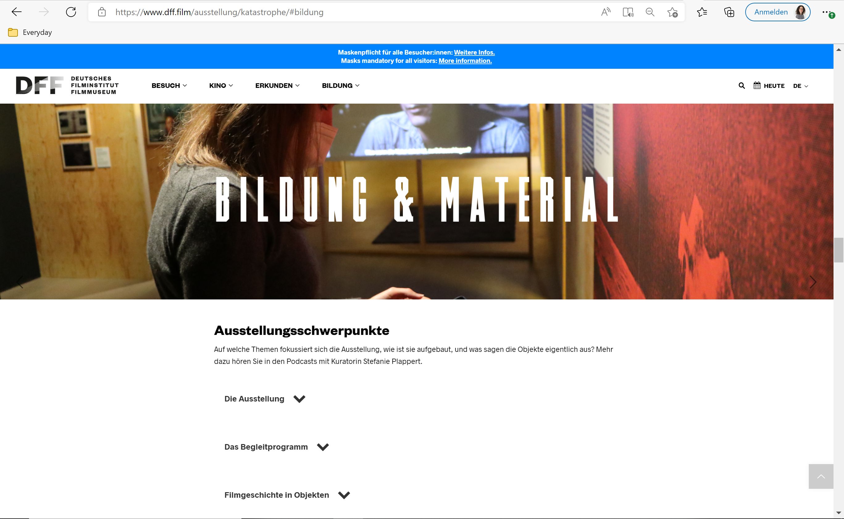 Nach Abschluss des Bildungsprogramms bzw. bei Beginn der Diskussion über die Implementierung geeigneter Angebote war der erste Schritt einer nachhaltigen Dokumentation die Erweiterung der bestehenden Projektwebsite. Alle Ergebnisse wurden zunächst auf dem Youtube-Kanal bzw. der Website des DFF veröffentlicht. Der nächste Schritt, anschließend an die reine Zugänglichmachung der Dateien, bestand in ihrer Erschließung. Auf der Projektwebsite sind nun unter dem Menüpunkt „Bildung“ Bild- und Tonaufzeichnungen (Videos und Podcasts), Abbildungen und Literaturhinweise, Filmtipps und Materialien als Ausgangspunkt für eine weitergehende Beschäftigung mit den Themen von Ausstellung und Bildungsprogramm versammelt, die die unterschiedlichen Medien übersichtlich gliedern und damit auf den ersten Blick zugänglich gestalten.