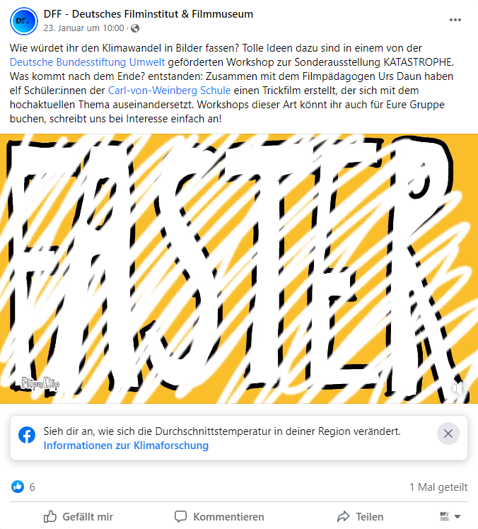 Für das Bildungsprogramm ist jedoch in jedem Fall aus Sicht des DFF ein positives Fazit zu ziehen: Ein wesentliches Ziel des Bildungsprogramms bestand in der doppelten Sensibilisierung eines jungen Publikums zu einem medienkritischen Umgang mit filmischen Bildern bei gleichzeitigem Nutzen ihrer Aussagekraft für relevante Themen der Gegenwart. Im Hinterfragen ihrer Machart und Kontextualisieren ihrer Aussagen, und durch das Zusammenführen von Informationen aus filmwissenschaftlicher wie auch naturwissenschaftlicher Perspektive konnte dies bei den Teilnehmer:innen erreicht werden, wie die Reproduktion und der kritische Einsatz ihrer Wirkmittel in den entstandenen Filmen belegen.