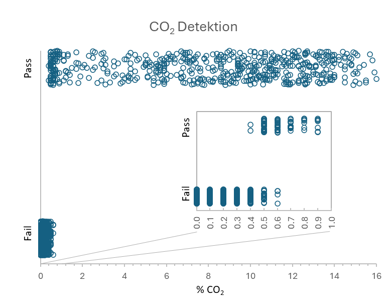 Die Luftdichtigkeit der hermetischen Säcke messen wir indirekt über den CO2-Anstieg in hermetischen Säcken, der durch Insekten, Schimmelpilze und die Getreideatmung verursacht wird. Nach nur einem Tag liegt die CO2 Konzentration deutlich über dem Detektionslimit von 0.7%. Allerdings ließ sich kaum ein CO2 Anstieg für Getreide aus dem Norden Ghanas messen, was wahrscheinlich auf eine insektenresistente Maissorte zurückzuführen ist. Der Sensor zeigt zuverlässig Konzentrationen ab 0.7% an.