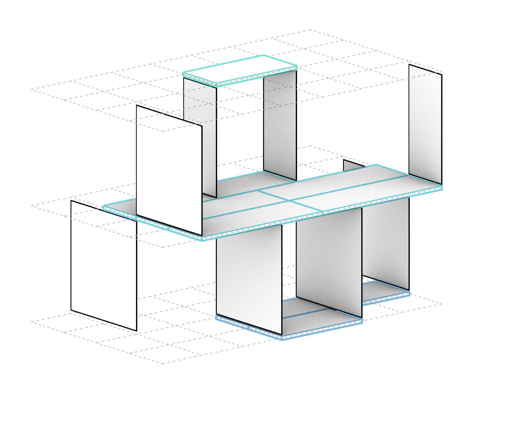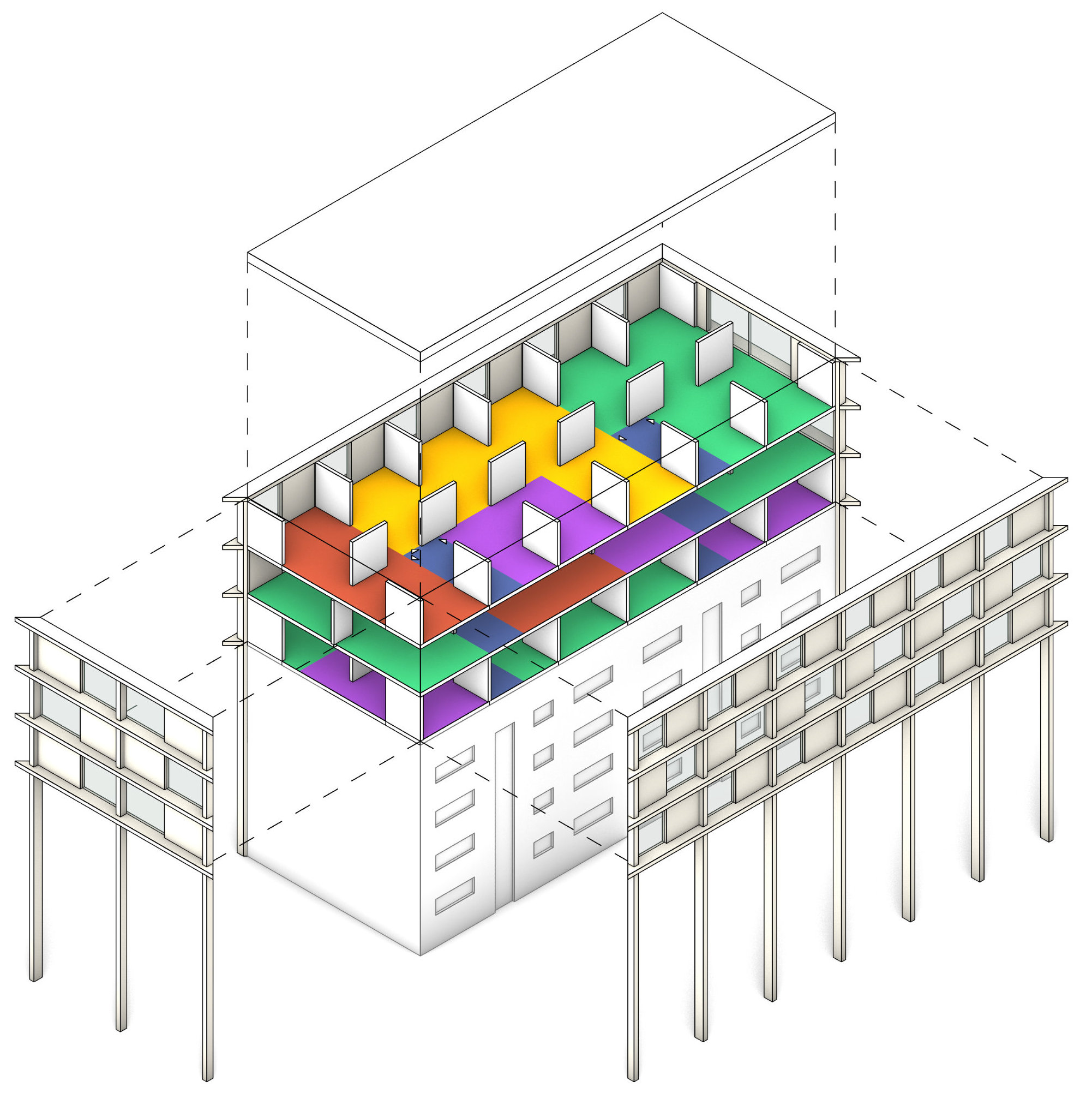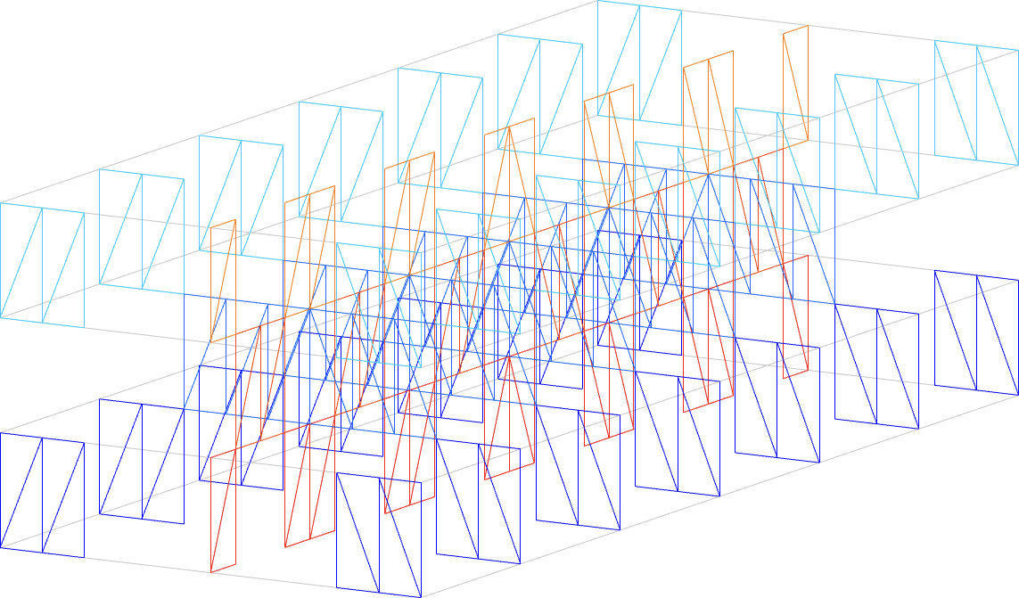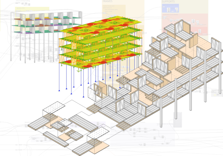 Das parametrische Modell wurde mit Hilfe von Rhino-Grasshopper entwickelt. Unter vereinfachten tragwerksplanerischen Annahmen, einer simplen rechteckigen Ausgangsituation (Bestands-Brutto-Fläche), sowie einer veränderbaren Raumaufteilung pro Etage, können Raumtragwerke anhand verschiedener Wandstellungen generiert werden. Abhängig davon generieren sich Raumfachwerk (Summe aller als Fachwerkträger aufgelöste Holztafeln) und Deckenelemente als flächige Elemente.