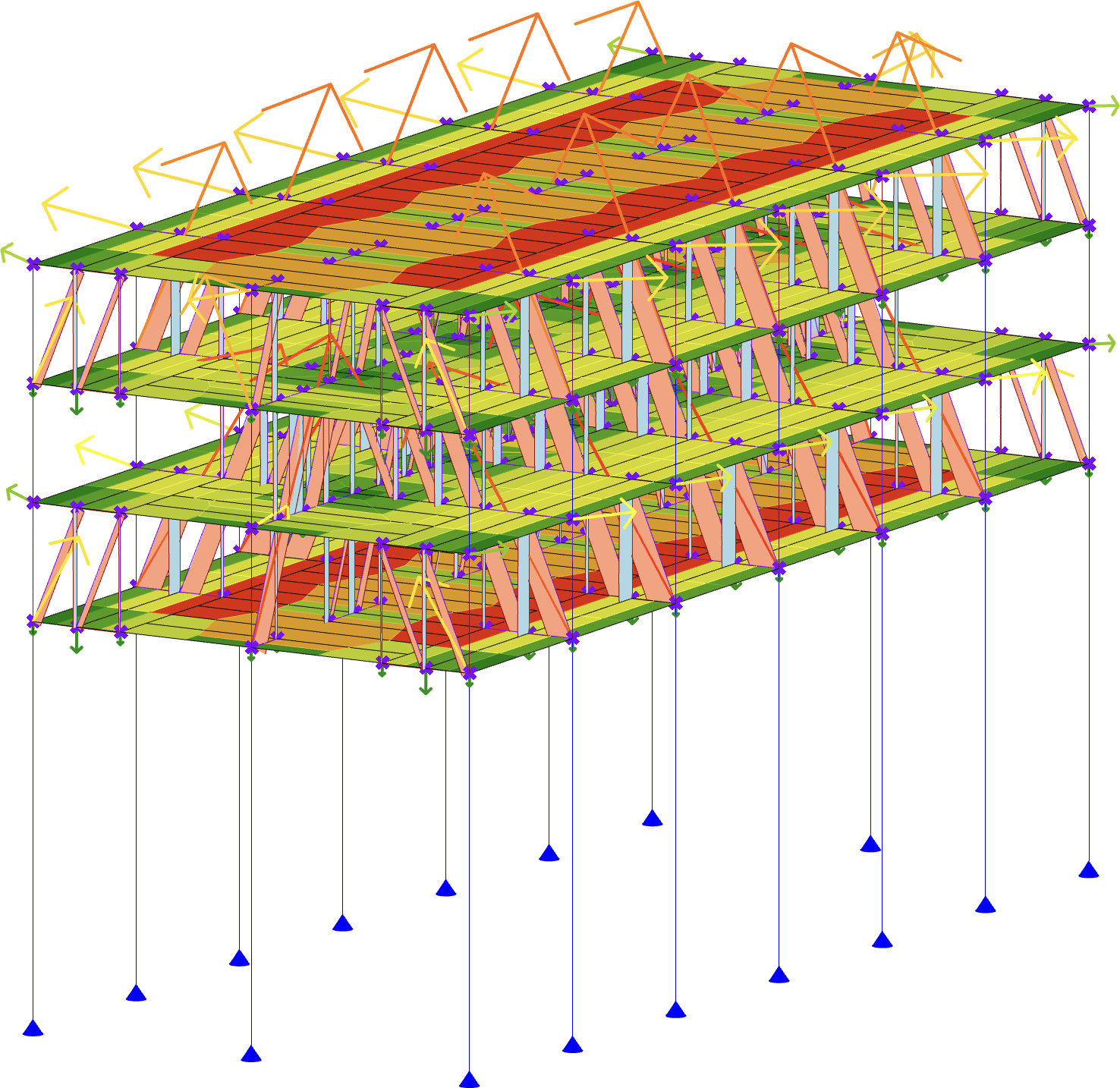 Die Machbarkeitsstudie zeigt, dass freispannende Aufstockungen mit räumlicher Tragwirkung bei bis zu drei Vollgeschossen mit moderaten Querschnitten der Konstruktion möglich sind. Unter vereinfachten tragwerksplanerischen Annahmen, einer simplen rechteckigen Ausgangssituation (Bestands-Brutto-Fläche), sowie einer veränderbaren Raumaufteilung pro Etage, können Raumtragwerke anhand verschiedener Wandstellungen generiert werden. Das Raumfachwerk generiert sich über die Summe aller, als Fachwerkträger aufgelösten Holztafeln und flächigen Deckenelemente.