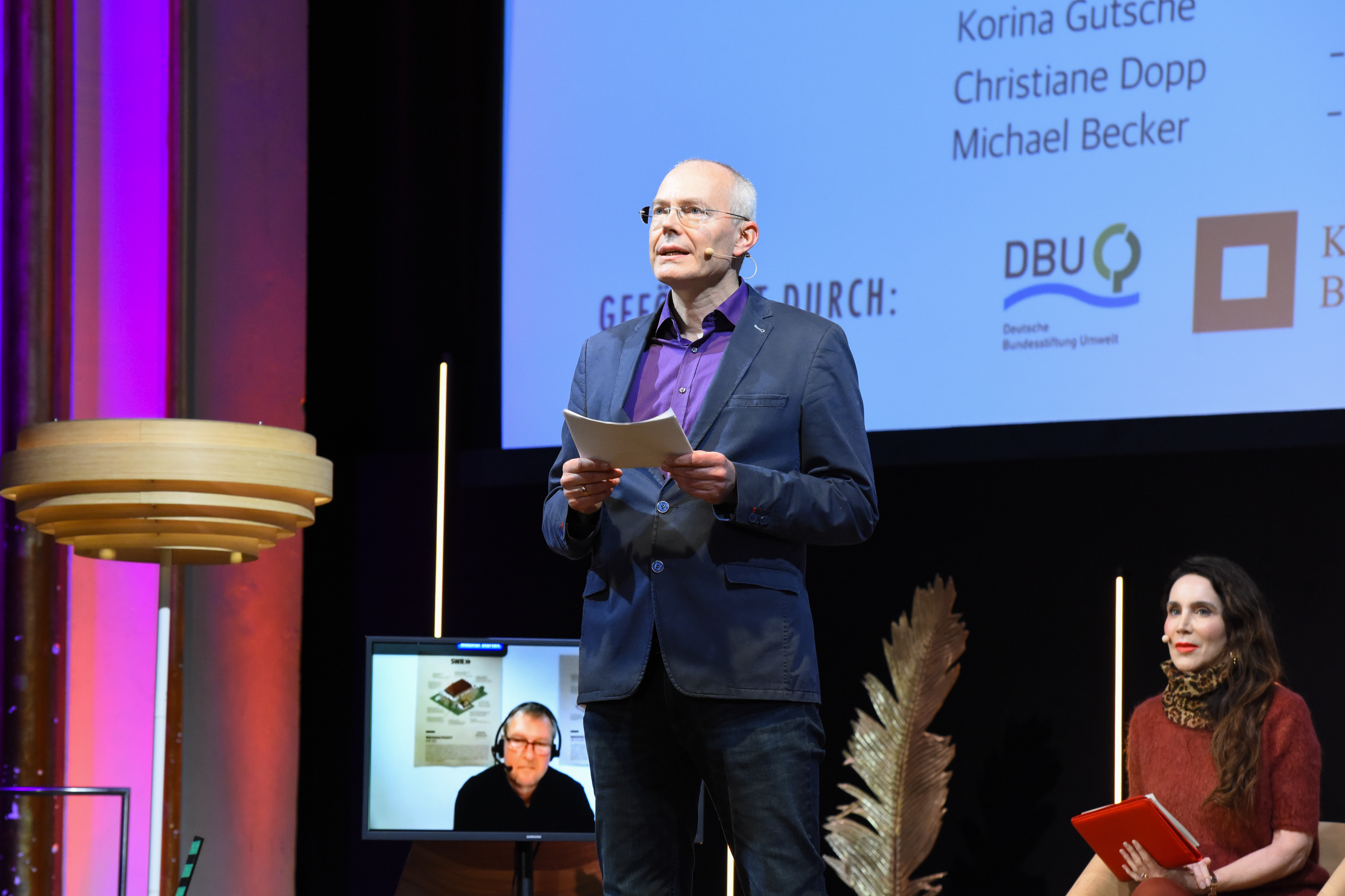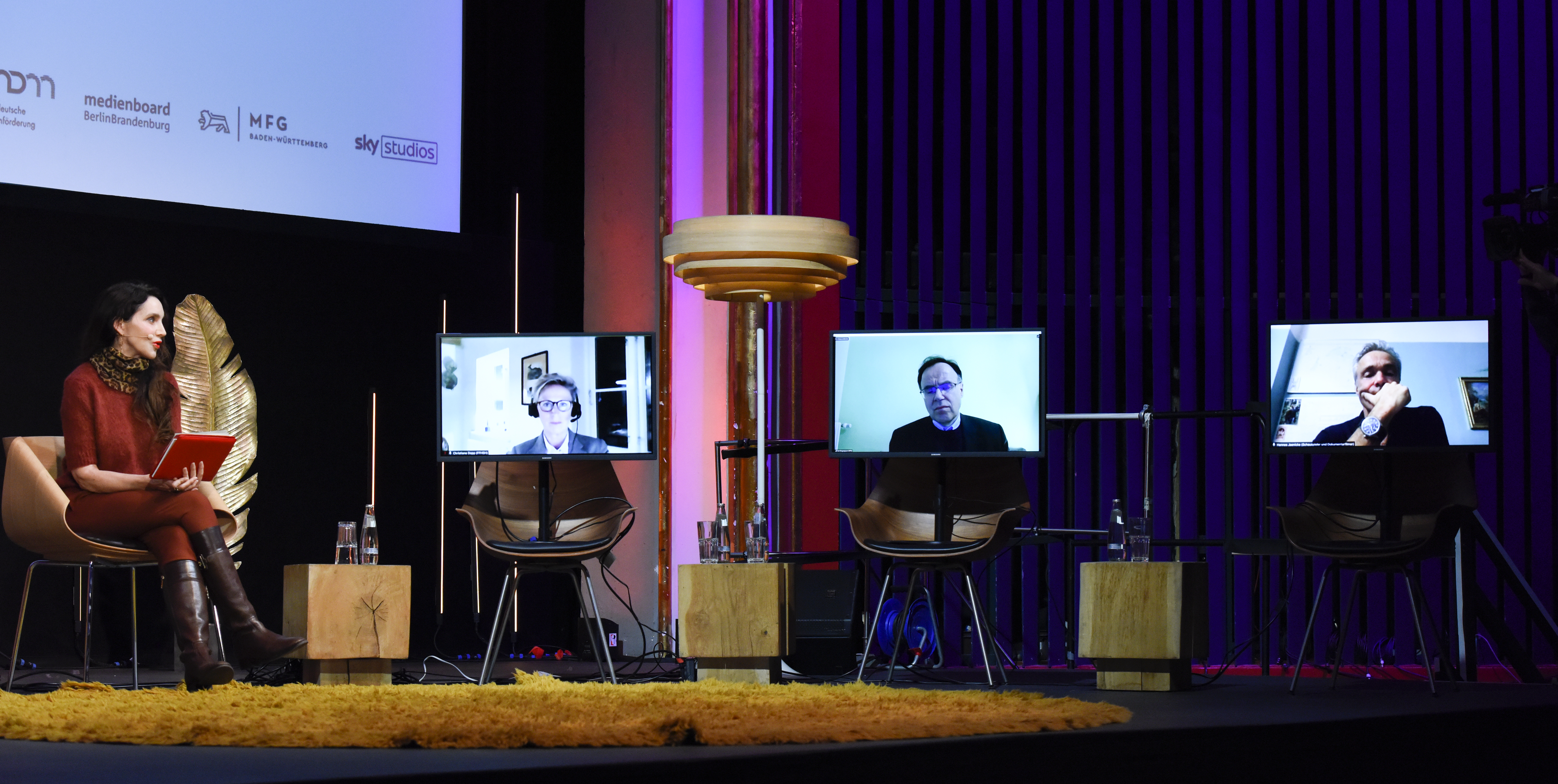 Der krönende Abschluß war die Podiumsdiskussion auf der festlich dekorierten Bühne des Babylon Kino in Berlin. Die Moderatorin Prof. Dr. Anabel Ternès von Hattburg konnte live auf der Bühne die Berliner Green Consultant Korina Gutsche begrüssen. Digital zugeschaltet waren der Schauspieler und Dokumentarfilmer Hannes Jaenicke, der Geschäftsführer der Medienförderung Baden-Württemberg Carl Bergengruen, der Green Production Manager von SKY Fabian Klaus, Christiane Dopp als Vertreterin der German Film Commissions und Michael Becker, Herstellungsleiter beim SWR und Vertreter der ARD-Nachhaltigkeitsinitiative und der ARD Arbeitsgruppe „Nachhaltige Medienproduktion“.  Engagiert und sachkundig wurde über Chancen, Herausforderungen und Zukunftsvisionen diskutiert.