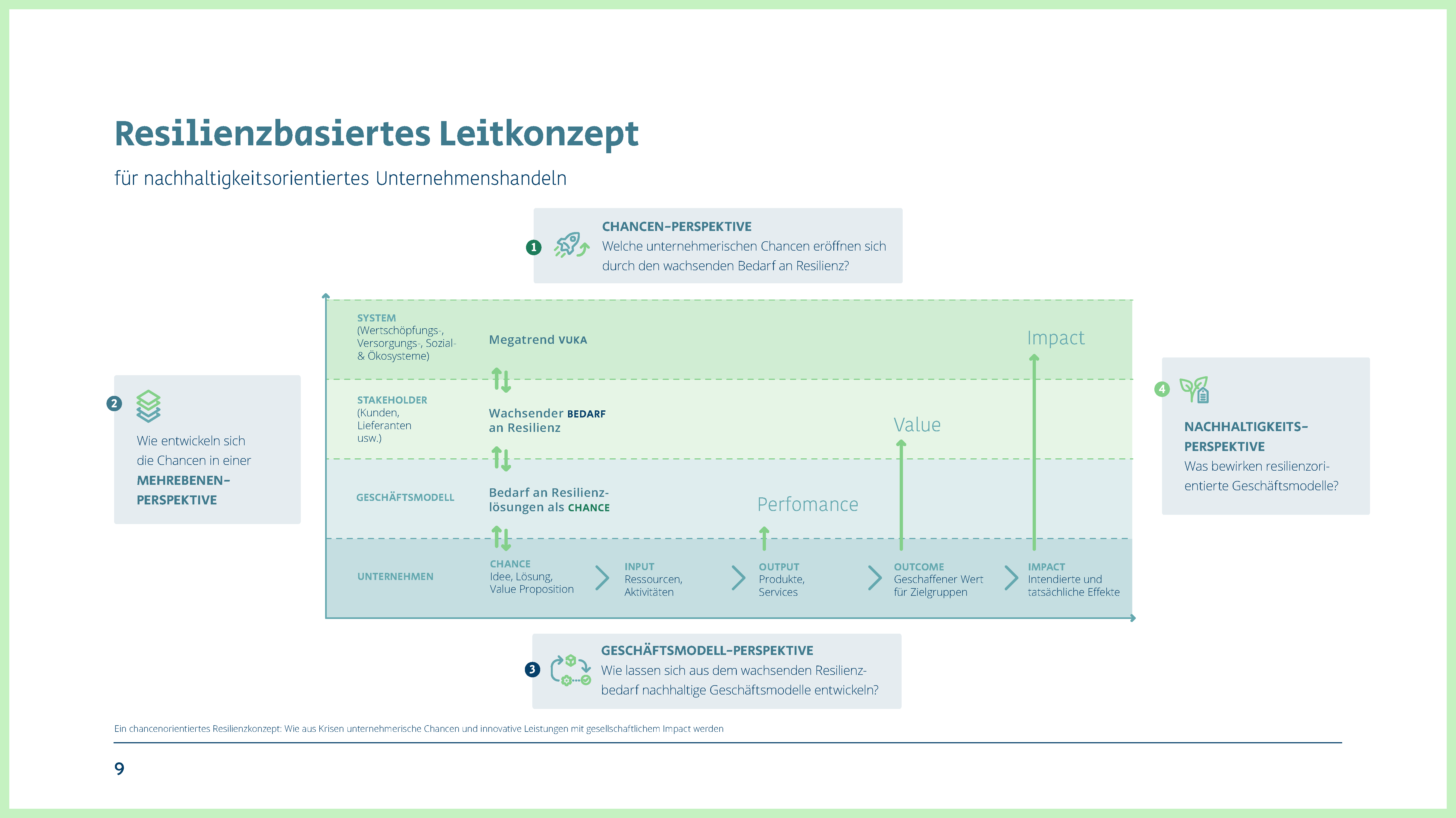 Wie die Arbeit mit etablierten Unternehmen und Start-ups im Rahmen des Vorhabens gezeigt hat, stimuliert die Idee von Resilienz als Dienstleistung für andere („Resilience-as-a-Service“) neue Sichtweisen, eröffnet unternehmerische Chancen und schafft einen Mehrwert für die Ge-sellschaft. Wir haben die im Rahmen der Vorhabens erarbeitete Praxishandreichung daher mit „Resilienz als Mehrwert“ überschrieben. Sie richtet sich an Unternehmen, Start-ups, Wirt-schaftsverbände und Fördereinrichtungen, die wissen möchten, was Resilienz über das Risikomanagement hinaus „kann“. Wir stellen in dem Guide das Konzept der chancenorientierten Resilienz vor, erläutern anhand von Unternehmensbeispielen und von vier zentralen unternehmerischen Aufgabenfeldern (Strategisches Management, Nachhaltigkeitsmanagement, Innovationsmanagement und Geschäftsmodellentwicklung), wie sich die Chancenperspektive erfolgreich für nachhaltiges Unternehmenshandeln nutzen lässt. Dabei verstehen wir Resilienz als viertes Nachhaltigkeitsprinzip, das die Grundsätze der Effizienz, Konsistenz und Suffizienz ergänzt.
