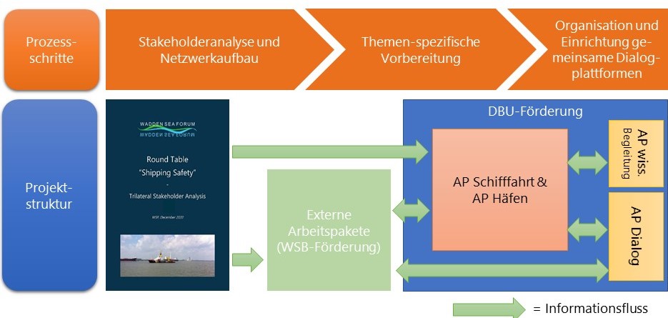 Die Durchführung einer ersten trilateralen Stakeholderanalyse (WSF, 2020) wurde als vorbereitende Maßnahme für die Organisation des Runden Tisches vom WSF erarbeitet. Darin sind die vorläufigen aber nicht abschließenden potenziellen Teilnehmer*innen an einem Austausch- und Diskussionsprozess zum Thema Schifffahrt im Welterbegebiet Wattenmeer benannt. Darüber hinaus sind in diesem Bericht erste Ergebnisse aus einer Kurzumfrage unter den identifizierten potenziellen Teilnehmer*innen vorgestellt worden. Diese Grundlagen müssen für das weitere Vorgehen unterfüttert und ergänzt werden. Eine Ergänzung ist beispielsweise für die Erarbeitung tiefer gehender inhaltlicher Themenpapiere zu in den oben genannten Kategorien möglichen Maßnahmen erforderlich. Diese Arbeiten sind essenziell sowohl als Vorbereitung für den Runden Tisch als für die einzusetzenden kleineren Arbeitseinheiten. Die beiden Projekte, sowohl das beim WSB beantragte als auch das vorliegende Projekt, werden enge Bezüge zum Runden Tisch haben. Eine Verknüpfung dieser beiden Projekte und des Runden Tisches ist über das WSF gegeben. Das WSF ist an allen genannten Projekten beteiligt und verantwortlich für den Runden Tisch.