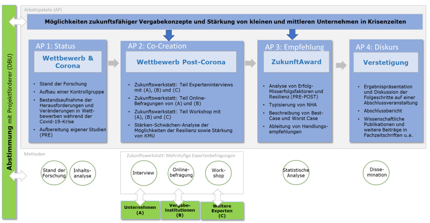 Hierfür werden (a) Möglichkeiten resilienter sowie erfolgversprechender Ansätze einer nachhaltigen Transformation der Vergabekonzepte und (b) Möglichkeiten der Stärkung kleiner und mittelständischer Unternehmen in deren Beurteilung aus Sicht von Vergabeinstitutionen (Awardgeber), Unternehmen (Awardnehmer) sowie weiterer Experten gesammelt und systematisiert sowie (c) strategische Empfehlungen für zukunftsfähige Umwelt- und Nachhaltigkeitswettbewerbe abgeleitet.