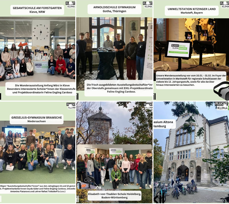 Die Ausstellung wurde an unterschiedlichen Bildungseinrichtungen gezeigt: u. a. in Volkshochschulen, Umweltzentren, Schulen verschiedener Schulformen, Weltläden, Haus der Jugend und kommunalen Einrichtungen. Gruppen Freiwilliger wurden als "Klimaschutzbotschafter*innen" geschult und begleiteten die Ausstellung während des Ausstellungszeitraums an ihrem Standort. Eröffnungsworkshops fanden mit Expert*innen und teils “Klimazeug*innen“ statt.