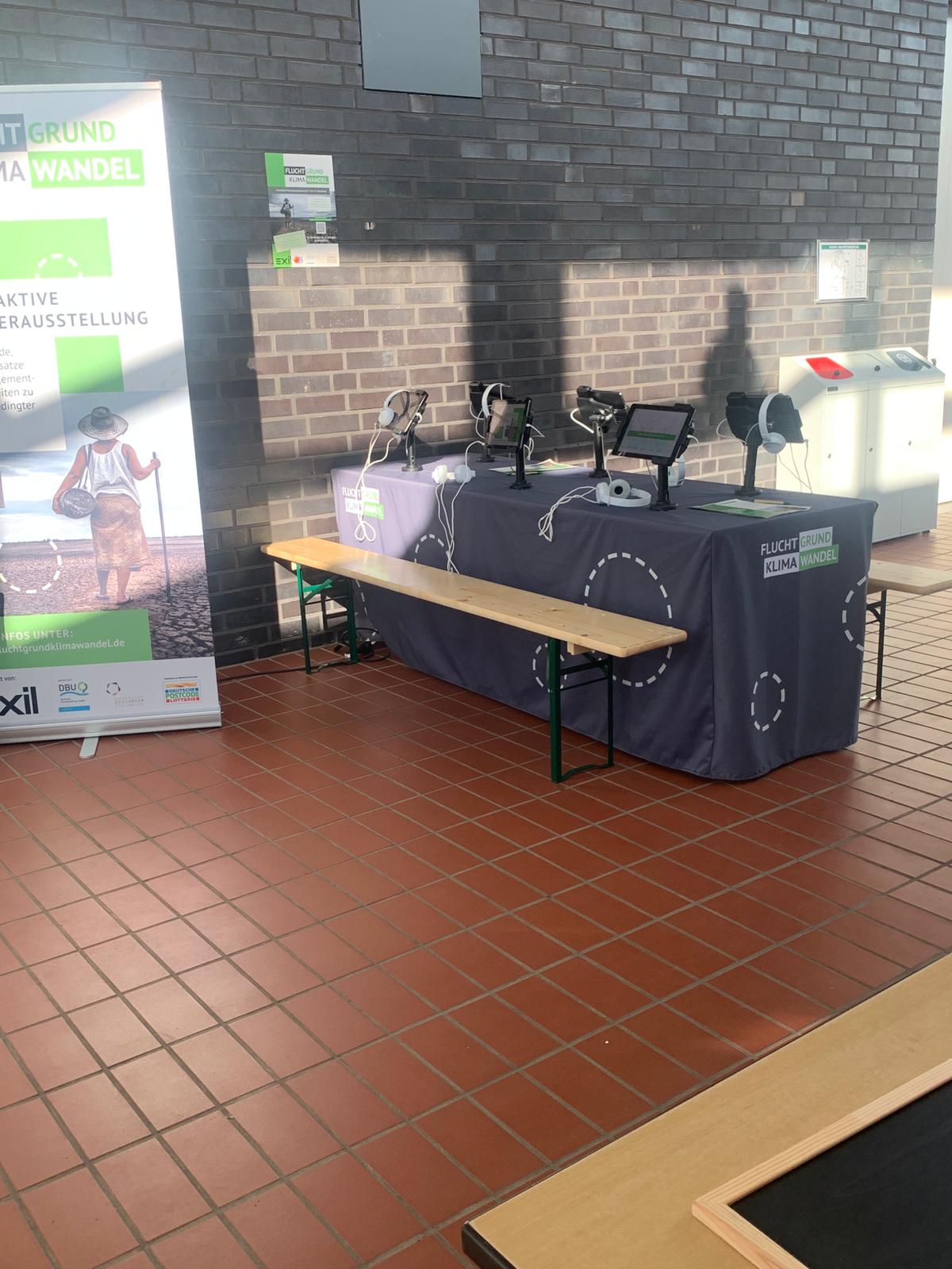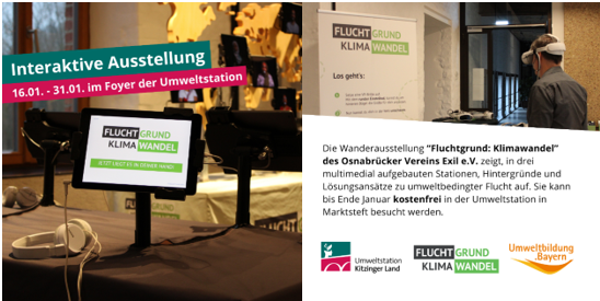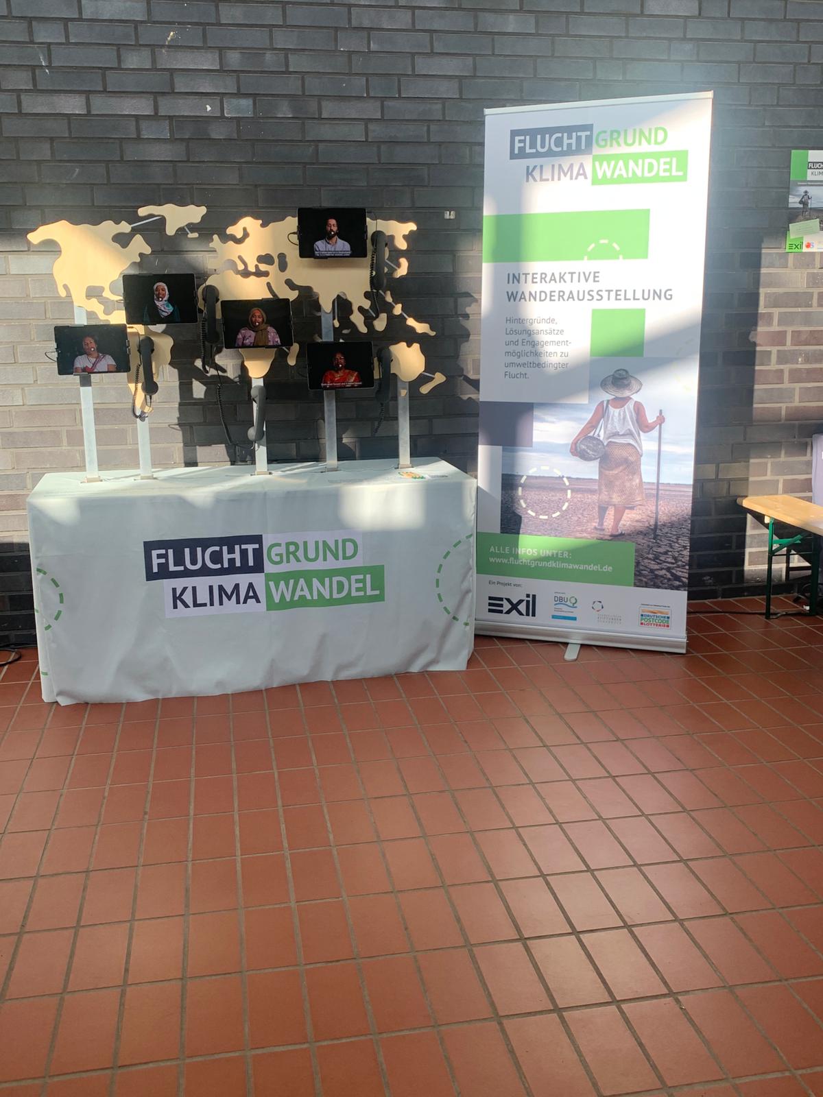 Von Juni 2022 bis Mai 2023 entstand die Ausstellung mit Unterstützung einer spezialisierten Agentur. Zentrales Element ist eine interaktive Weltkarte mit Videowürfeln, in denen Betroffene aus Kolumbien, Sri Lanka, Marokko, dem Sudan und dem Iran über klimabedingte Flucht berichten. Ergänzend wurde eine Virtual-Reality-Station entwickelt, die 360°-Einblicke in Klimaschutzprojekte in betroffenen Regionen (Indien, Indonesien, Äthiopien, Argentinien) bietet. Zudem informiert ein digitaler Infostand über Engagementmöglichkeiten. Gleichzeitig entstanden didaktische Materialien wie Arbeitsblätter und ein pädagogisches Begleitheft, eine Projektwebseite, Social-Media-Kanäle und Öffentlichkeitsmaterialien im Corporate Design.