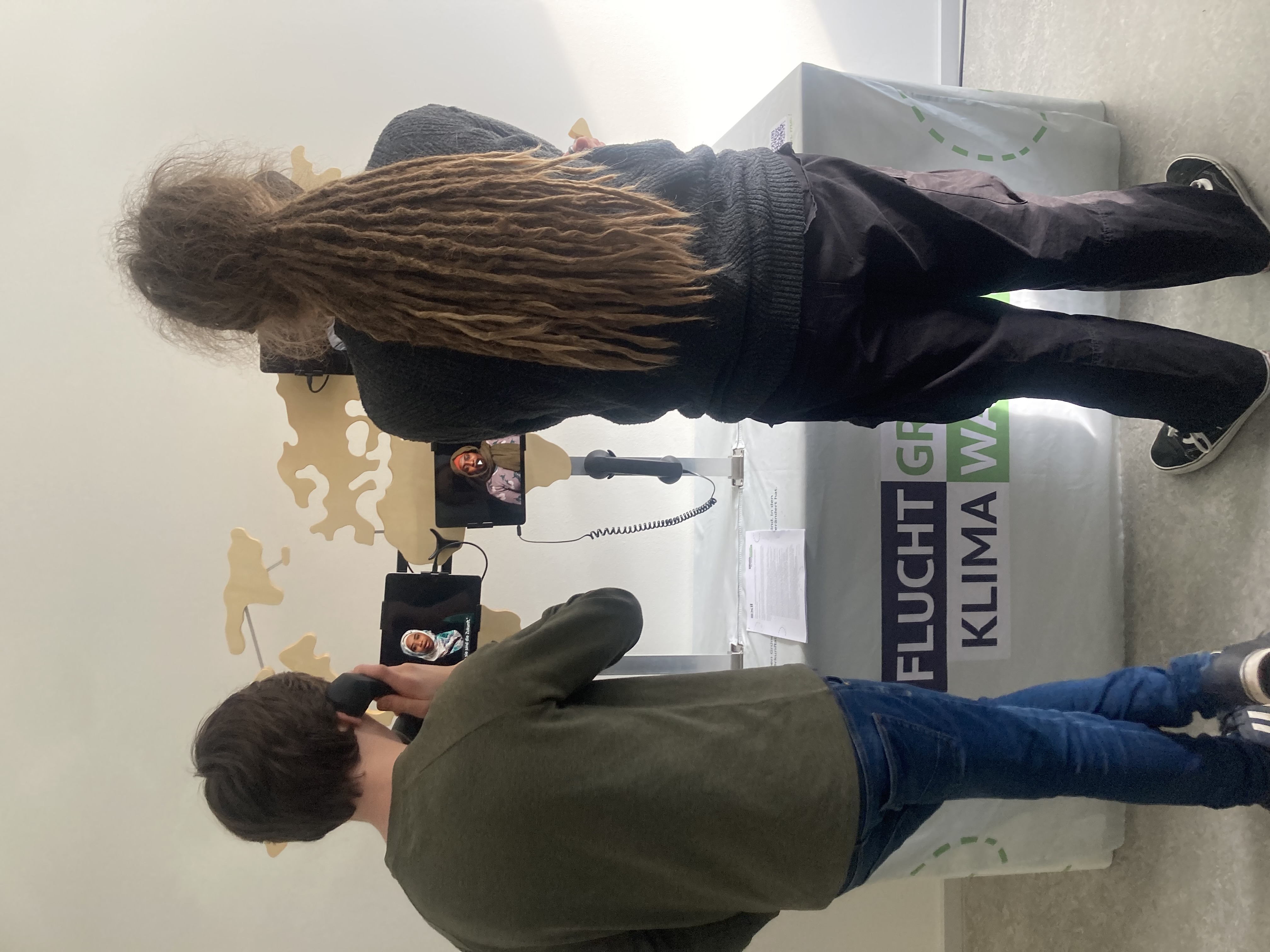 Im ersten Meilenstein (01.03.2022–31.05.2023) standen Konzeption und Produktion der Ausstellung samt Begleitmaterialien im Fokus. In den ersten sechs Monaten erfolgten Recherche, Workshops an Schulen sowie die Identifikation von “Klimazeug*innen“. Die Workshops fanden mit zahlreichen Schulklassen und Lehrkräften der Fächer Politik, Religion und Geografie statt, um den Wissensstand der Zielgruppe zu analysieren und zentrale Themen für die Ausstellung zu entwickeln. Parallel wurden Didaktik-Expert*innen eingebunden und mithilfe von Netzwerkpartnern wie Pro Asyl, Terre des Hommes und Flüchtlingsräten "Klimazeug*innen“ gesucht, die ihre persönlichen Erfahrungen mit klimabedingter Flucht einbrachten.