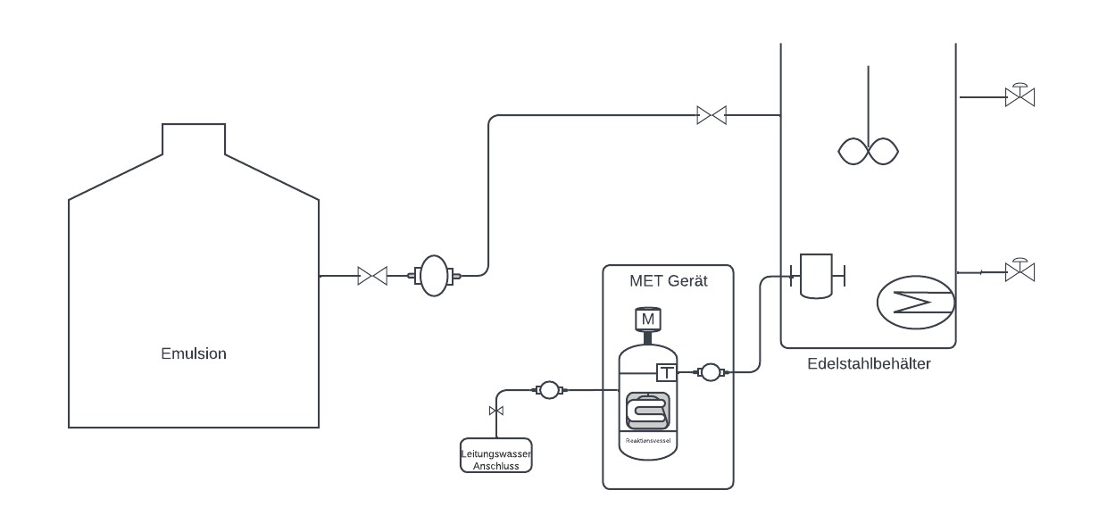 Vor dem Umfüllen der Emulsion in zwei Edelstahlbehälter wurde diese im IBC-Container mit einem Rührwerk homogenisiert. Die beiden 200-Liter-Versuchsbehälter wurden bis zu einem Füllstand von maximal 75 % befüllt und zur Identifizierung mit den Nummern T1 und T2 versehen. Im nächsten Schritt wurde ein Edelstahltauchheizkörper eingesetzt. Der Heizer war an einen Temperaturregler angeschlossen, um die Emulsion auf mindestens 60 °C zu erhitzen, sowie an einen Energiezähler, um den Energieverbrauch zu erfassen. Die Temperatur wurde regelmäßig kontrolliert und die Emulsion für eine gleichmäßige Erwärmung etwa eine Minute gerührt. Nach Erreichen der vorgegebenen Temperatur wurde die Behandlung am Edelstahlbehälter T1 mit dem MET-Gerät mittels mikrowellenbehandelten Leitungswassers durchgeführt.