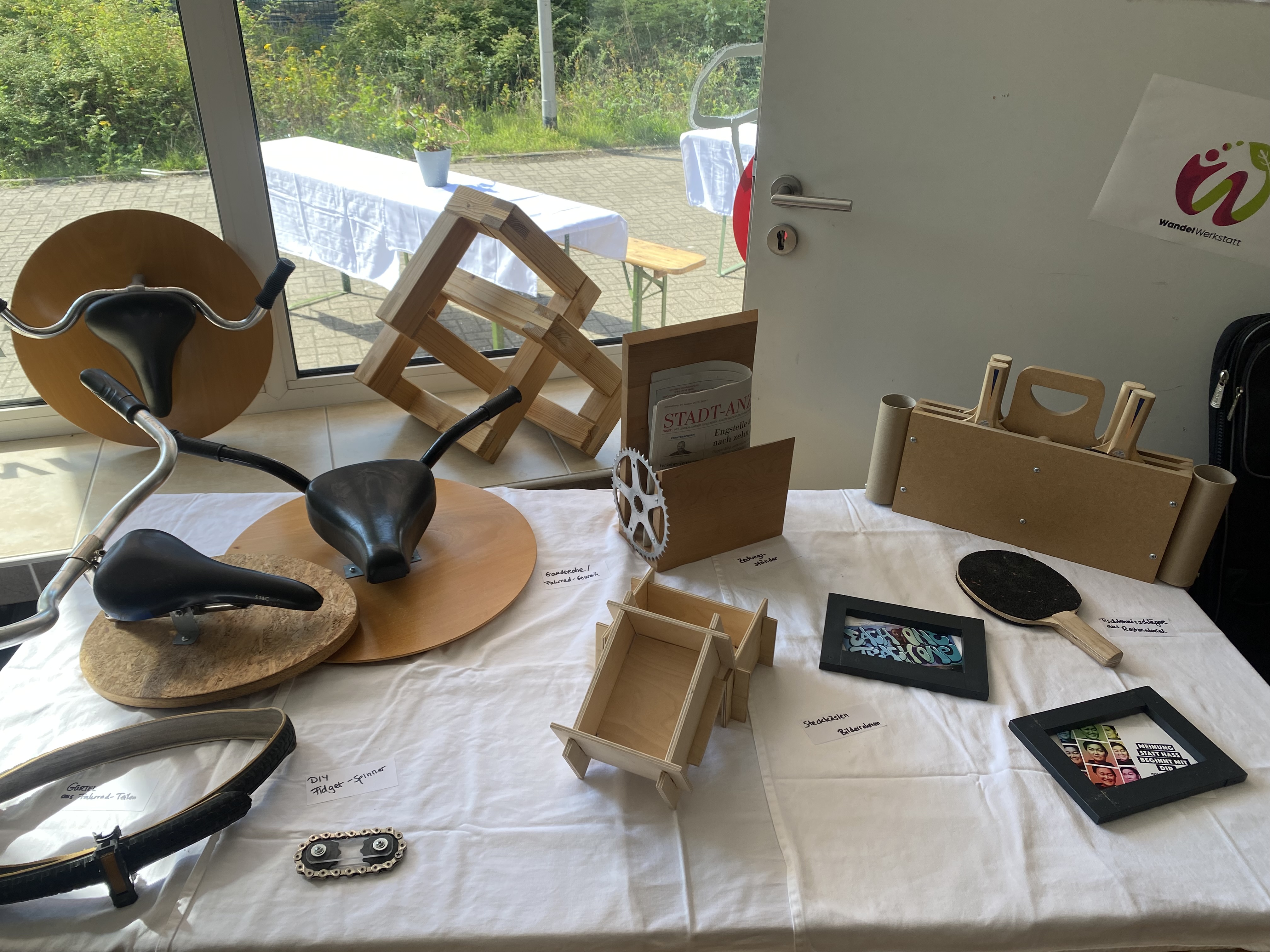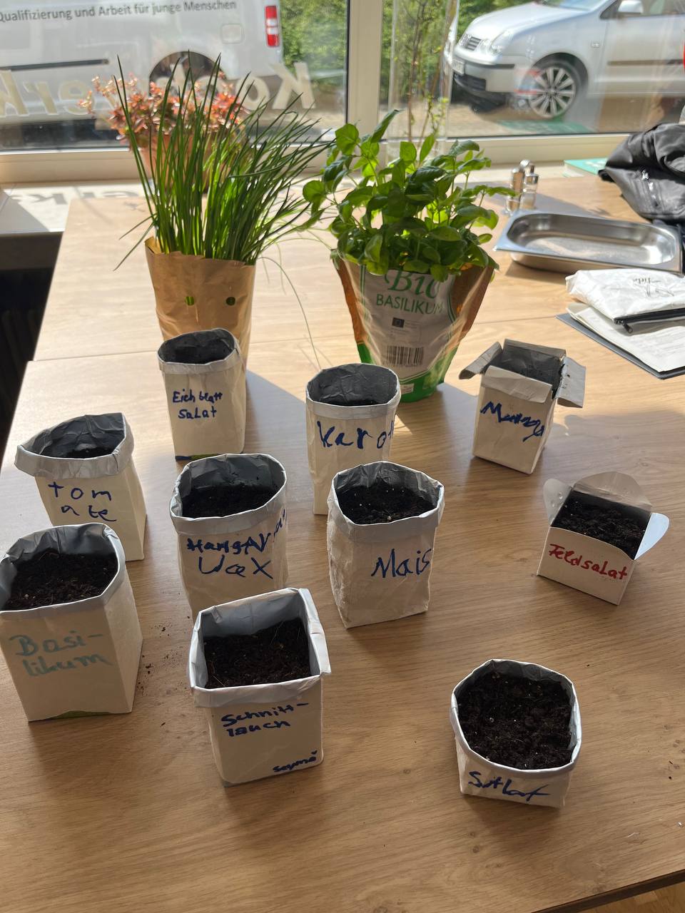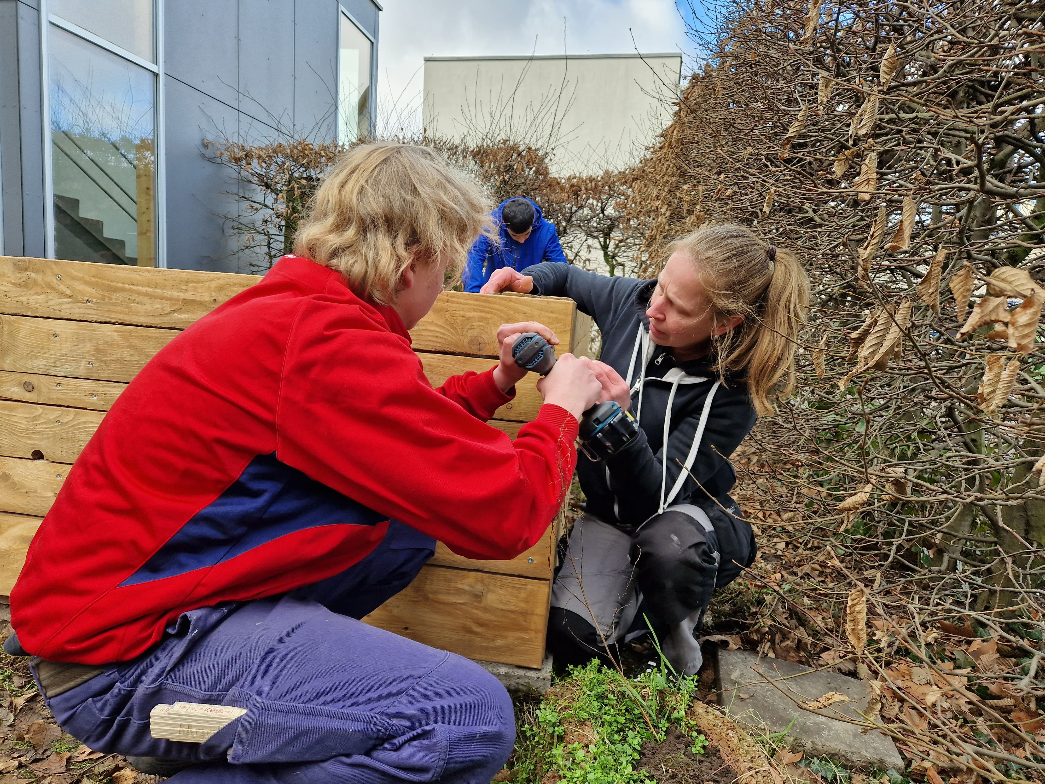 IV: Handeln: Die Teilnehmenden realisierten ein Praxisprojekt, das berufliche Fertigkeiten aus einer oder mehreren Bereichen der Jugendwerkstätten aufgriff. Sie übersetzten ihr theoretisches Wissen in praktisches Handeln und entwickelten ein gemeinsames Produkt, was sinnbildlich für das Projekt steht. Es entstanden diverse Upcycling-Projekte, aus Abfällen der Werkstätten und zwei Hochbeete, die im Bereich Hauswirtschaft bewirtschaftet werden.