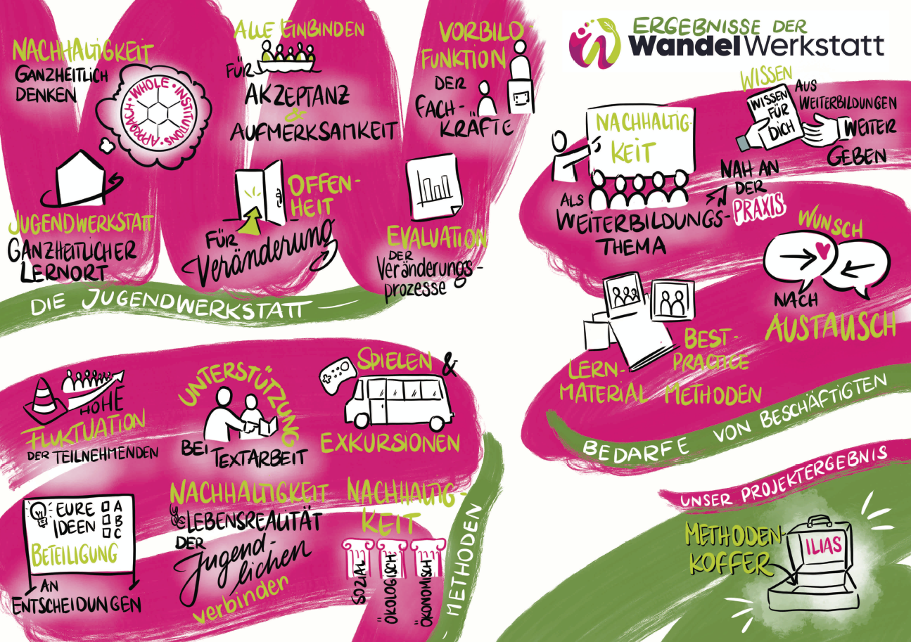 Ein Ergebnis war z.B., dass alle Büromaterialien nun von einem nachhaltigen Anbieter bezogen werden und es ein verändertes Angebot (regional und vegetarisch) in der Kochwerkstatt gibt. Zukünftig sollen die globalen Zusammenhänge von ressourcenschonendem Handeln, regionalem, saisonalem, biologischem und fairem Bezug der Materialien und der Verwendung von umweltschonenden Werkstoffen kontinuierlich in der Arbeit der Jugendwerkstätten thematisiert werden sowie seine praktische Umsetzung finden. Das Projekt hat somit über seine Laufzeit hinaus eine nachhaltige Wirkung.