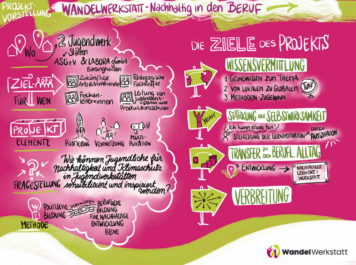 Das Projekt „WandelWerkstatt“ ist im Fördercluster „Bildung für Nachhaltige Entwicklung (BNE) und Politische Bildung“ der Deutschen Bundesstiftung Umwelt gefördert worden. Es richtete sich an zukünftige Arbeitnehmende, die in Jugendwerkstätten auf das Berufsleben vorbereitet werden und verknüpfte BBNE mit Methoden und Ansätzen der politischen Bildung. Die Teilnehmenden nahmen Perspektiven der BNE auf nachhaltiges Wirtschaften ein, wurden in ihrer Selbstwirksamkeit gestärkt und reflektierten ihr berufliches Handeln in gesellschaftspolitischen Zusammenhängen.