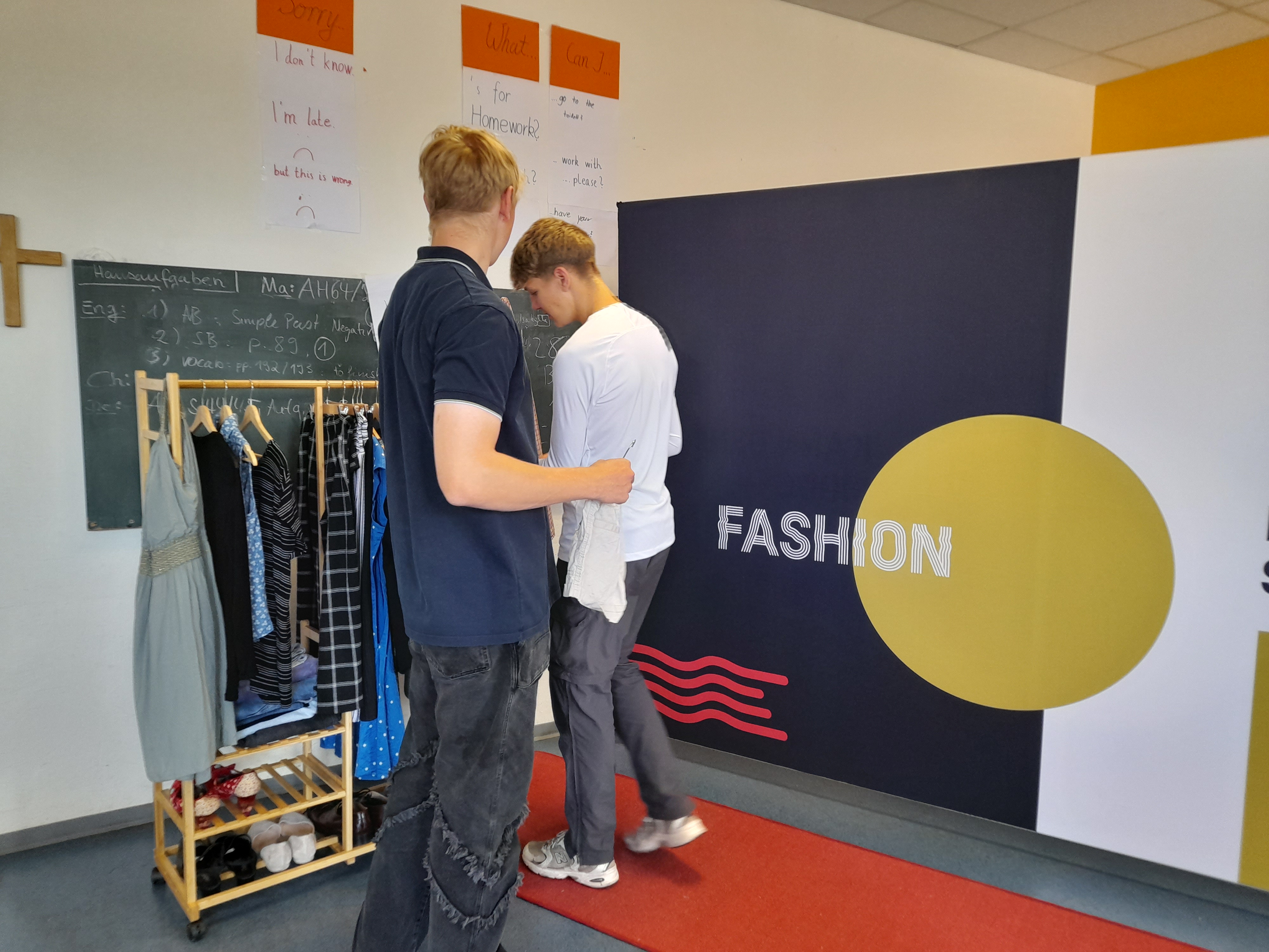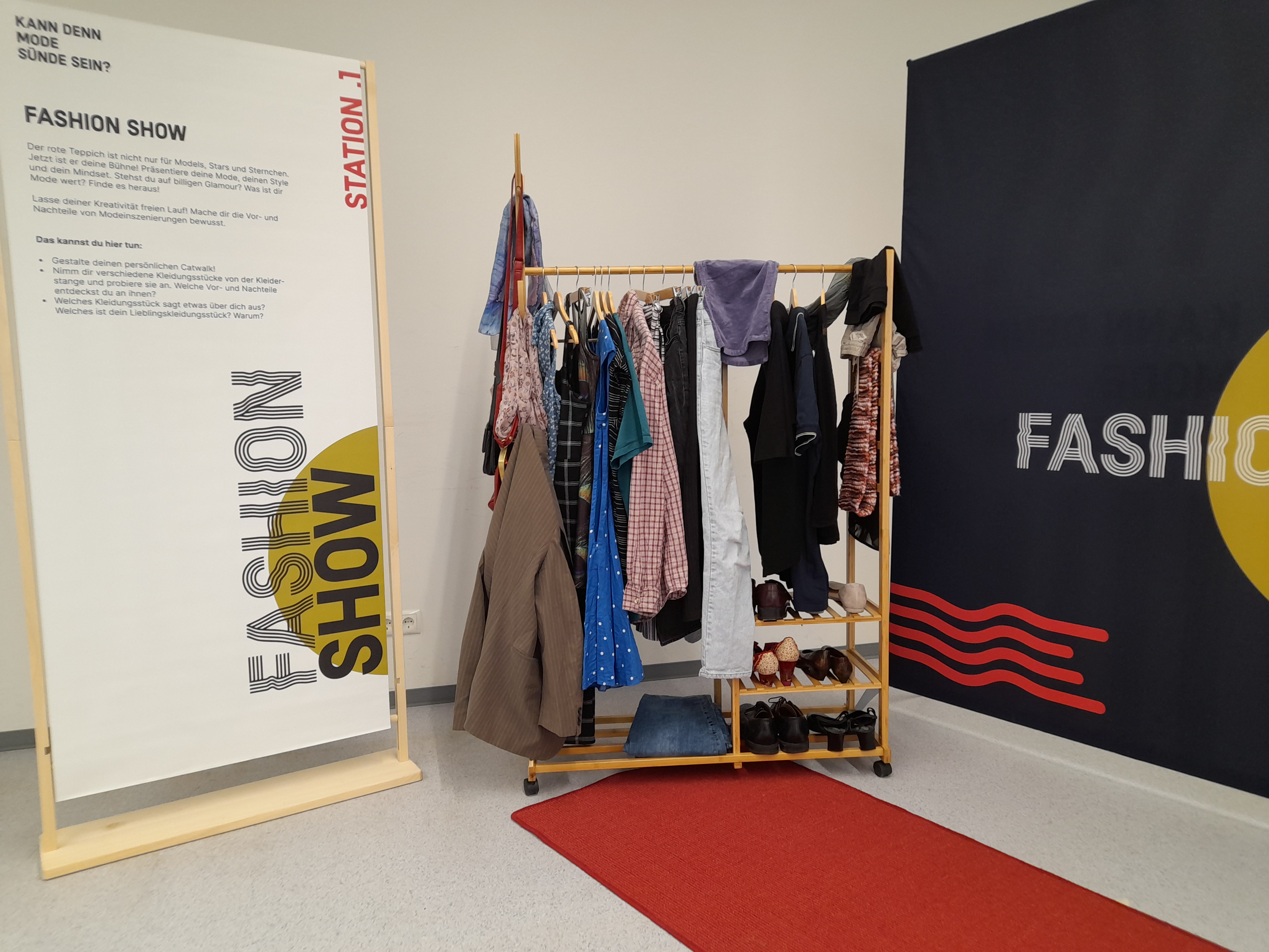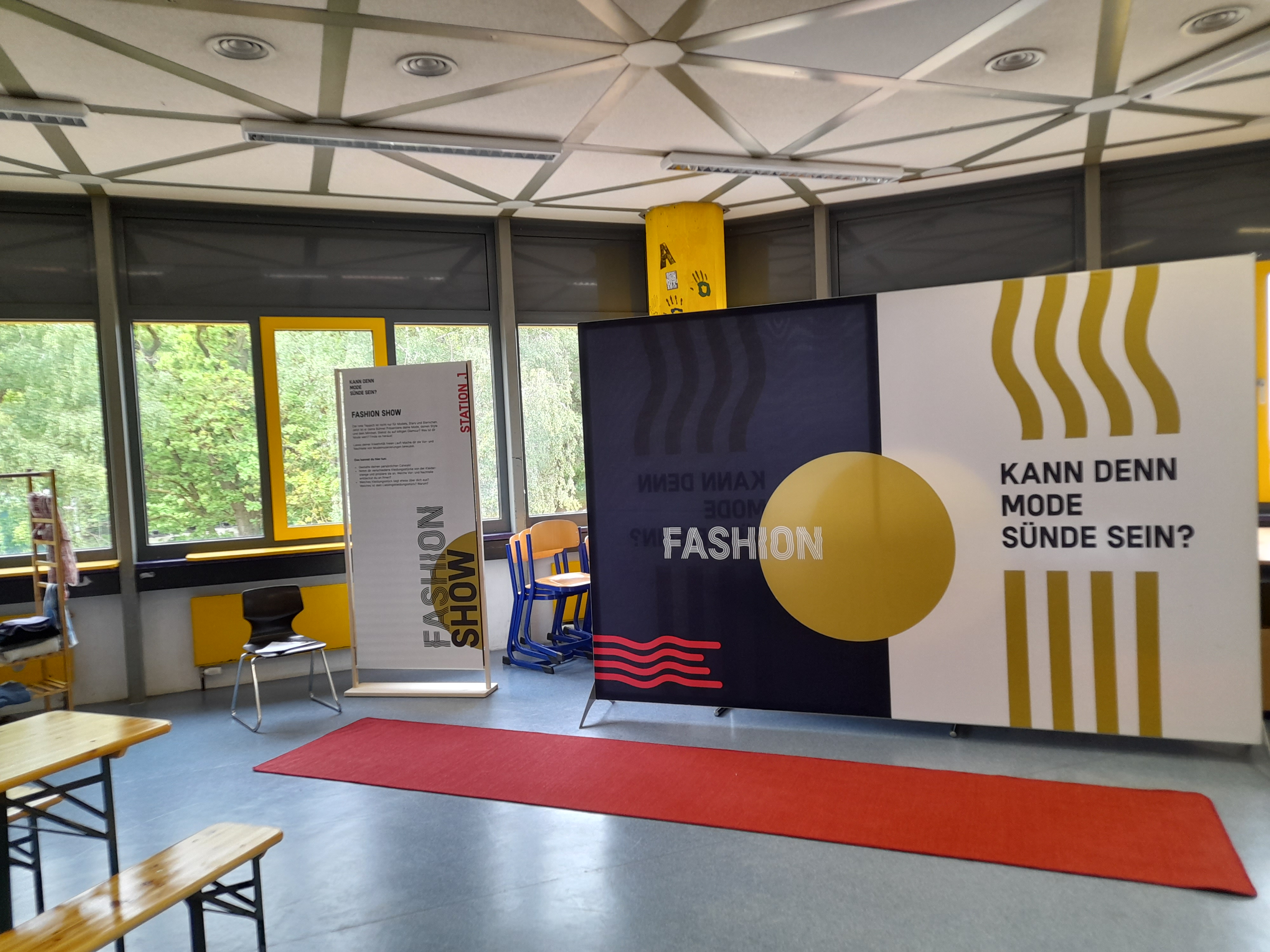 In der Entwicklungsphase (11/22 - 03/23) wurde seitens der Ausstellungsagentur das konkrete Konzept für die Erlebnisausstellung erarbeitet. Die Ausgestaltung der einzelnen Ausstellungselemente erfolgte im engen Austausch zwischen der Bildungsstätte und der Ausstellungsagentur. Konzipiert wurden drei Stationen: FAHION SHOW, FASHION RESEARCH und FASHION VIEW. Ein besonderer Fokus bei der Entwicklung und Beschaffung der Ausstellungselemente lag auf der Berücksichtigung von Nachhaltigkeitsaspekten. Parallel zur Ausstellungsentwicklung wurde seitens der HÖB das pädagogische Begleitprogramm entwickelt. Über das bestehende Netzwerk der HÖB und des RUZ Papenburg erfolgte zeitgleich die Akquise von teilnehmenden Schulen.