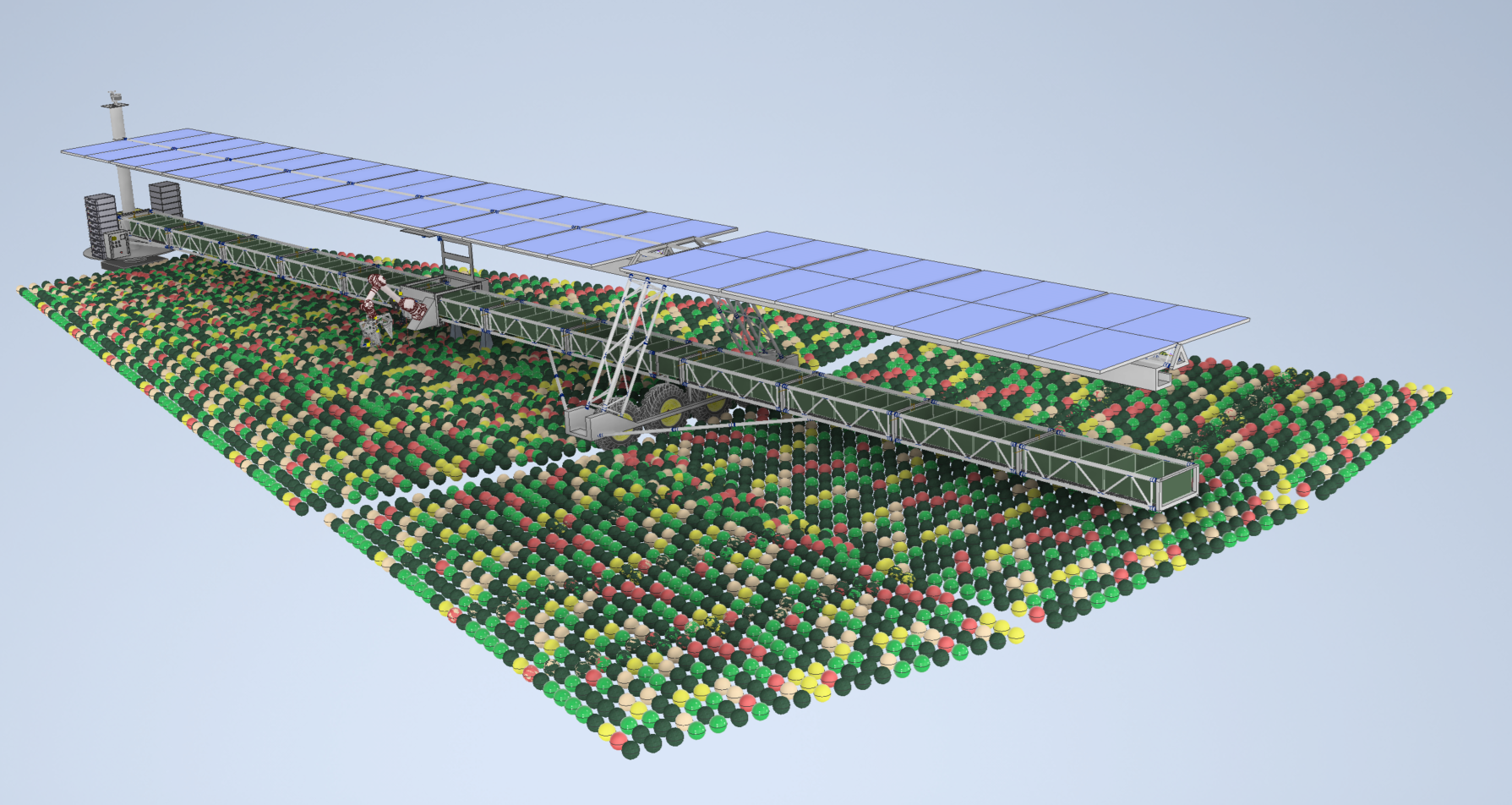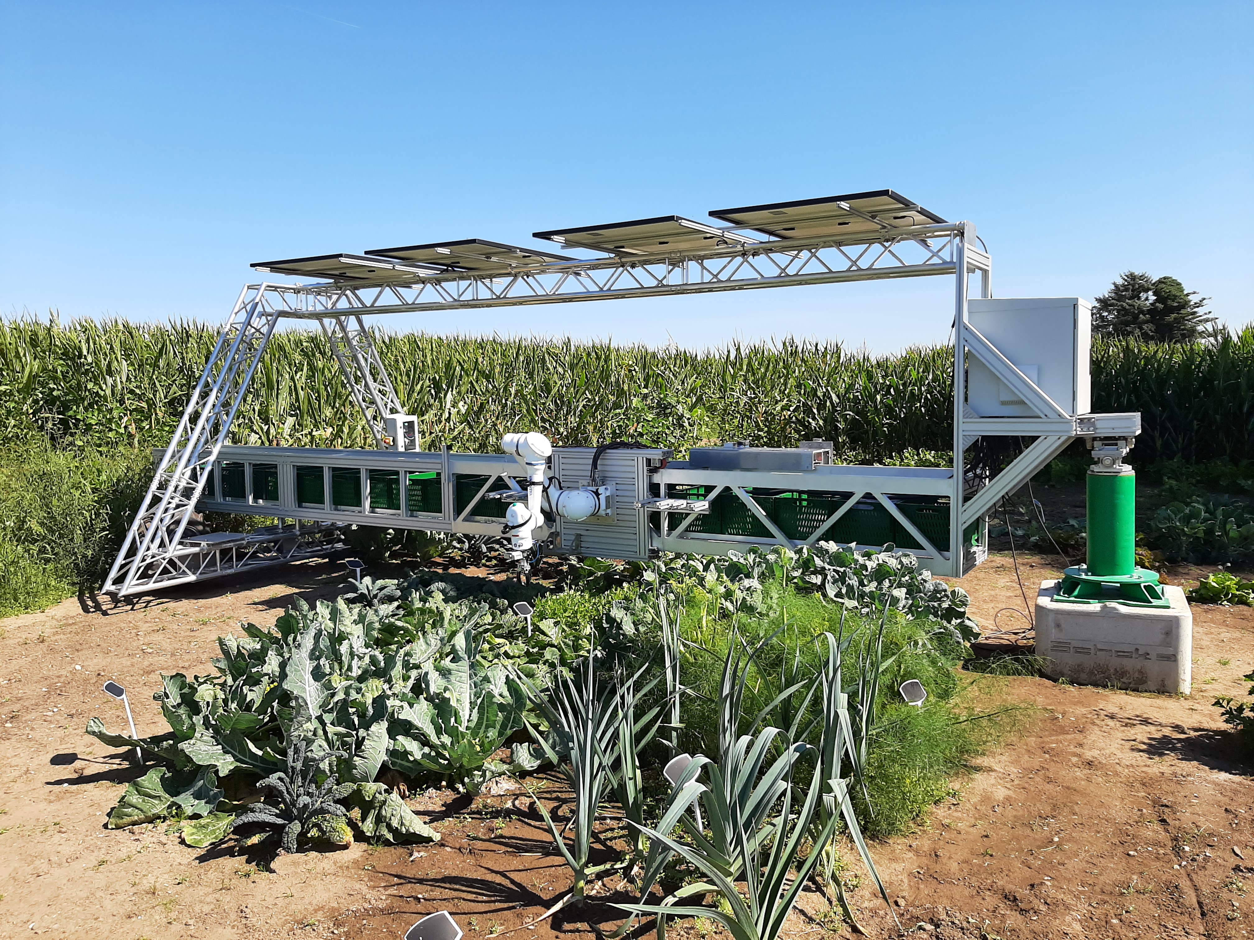 Die Realisierung des Versuchsaufbaus mit 8m Systemradius erfolgte zunächst in der Halle, bevor es auf das Testfeld ging. Die Anschließenden Feldtests zur Systembewegung, Pflanzenerkennung, Bodenbearbeitung, Pflanzung von Setzlingen und Ernte konnten bereits mit Hilfe der PV-Paneele des Systems energieautark durchgeführt werden.