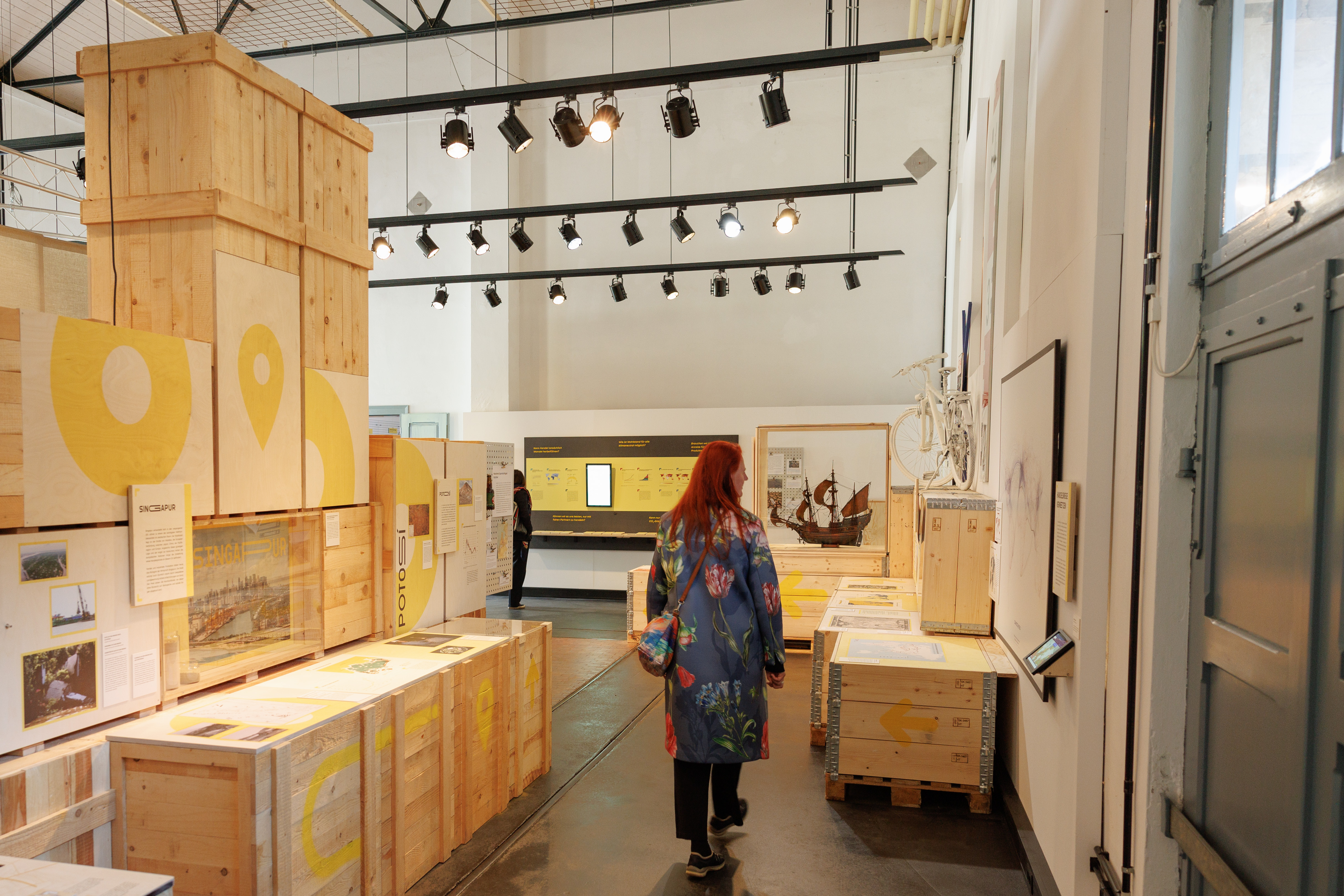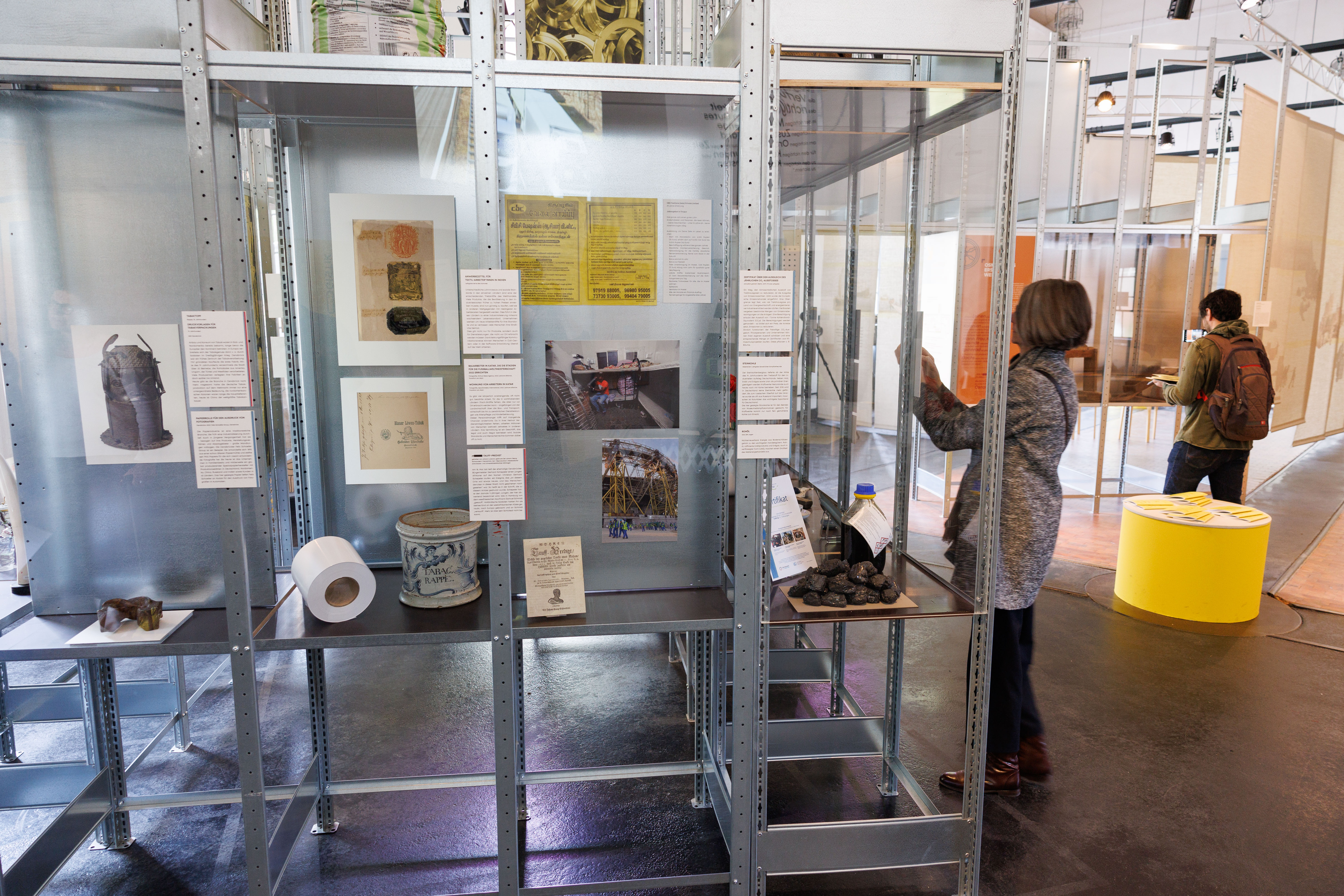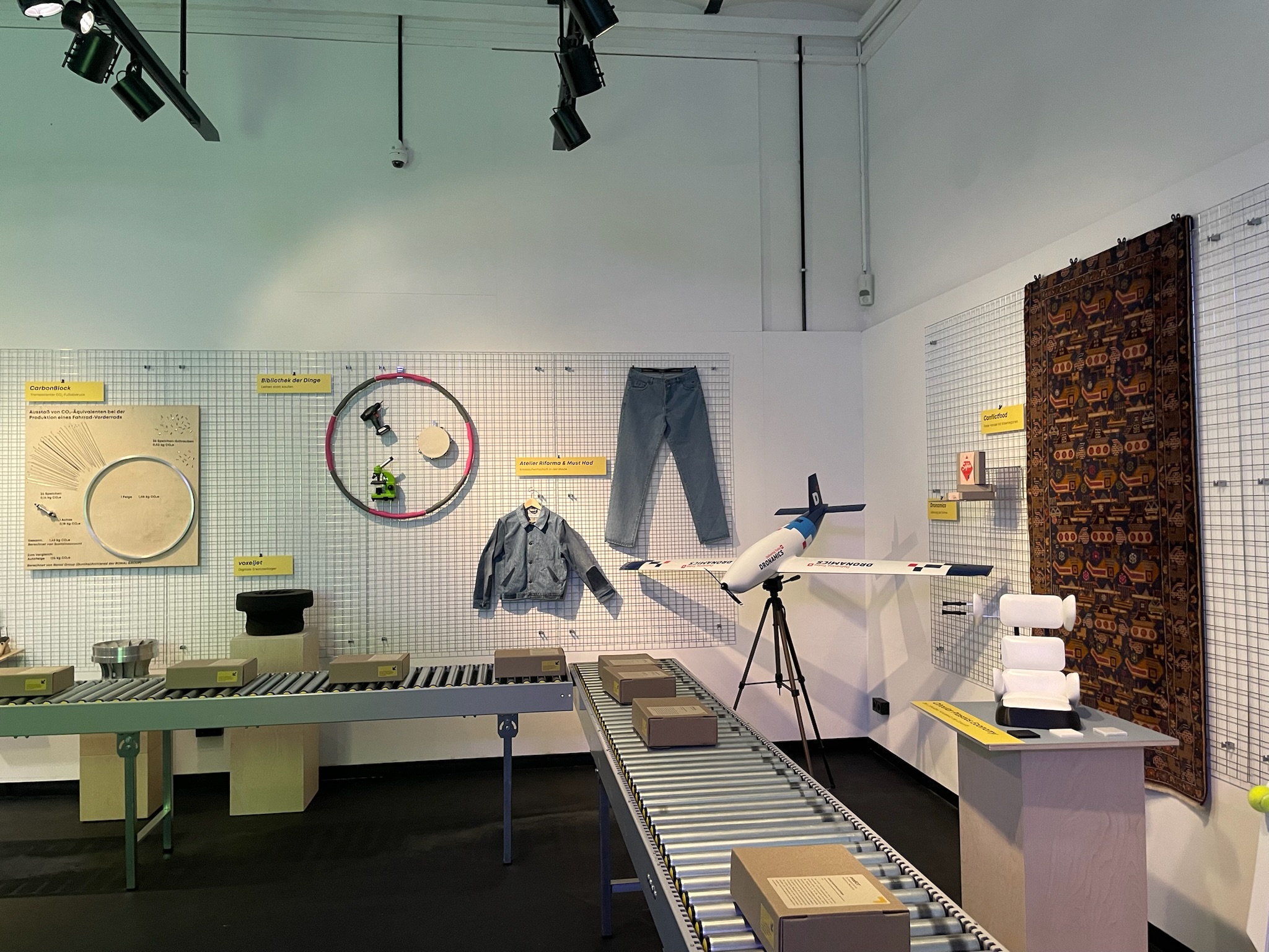 Ziel war zudem, die Ausstellung möglichst nachhaltig zu gestalten. Verwendet wurden vornehmlich upgecyclete Materialien, die Logistikunternehmen zur Verfügung stellten – Paletten, Transportkisten, Hochregallager etc. Bereits im MIK vorhandene Vitrinen und Möbel wurden umgebaut und neu gestaltet; sofern z. B. aufgrund bestimmter Exponatanforderungen neue Möbel gebaut werden mussten, wurden diese so angelegt, dass sie im Anschluss wieder verwendet werden können. Transportfähigkeit und modulare Bauweise waren mit Blick auf die geplante Wanderschaft weitere Leitlinien. Das Projekt bot somit die Möglichkeit, nachhaltige Strategien zu erproben.