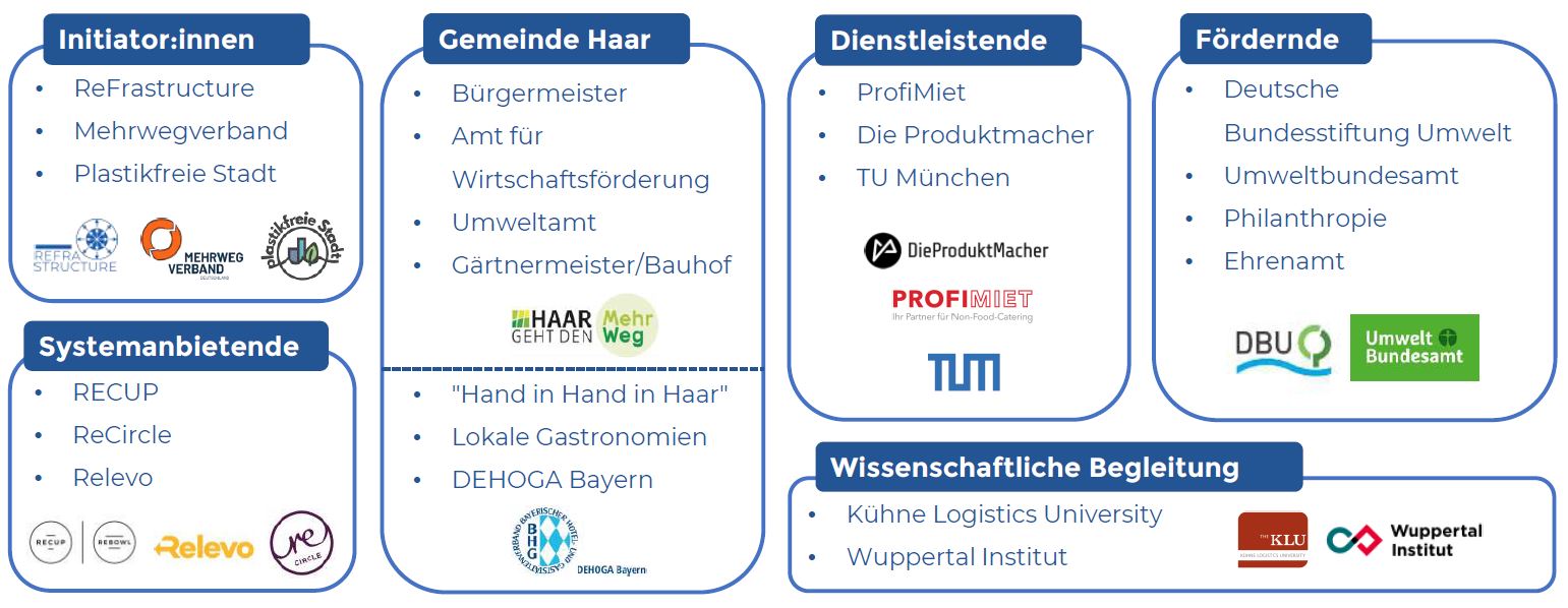Die Stiftung ReFrastructure hat es sich mit dem Pilotprojekt in der Gemeinde Haar zum Ziel gesetzt die Idee einer systemübergreifenden Infrastruktur für Mehrweg im Take-Away Bereich erstmalig physisch und digital in einem Mikrokosmos zu testen. Gemeinsam mit den drei Mehrweg-Systemanbietern (RECUP, ReCircle und Relevo) wurde in Haar über drei Monate ein verdichtetes Rückgabe-Netz simuliert, in dem Mehrwegbehältnisse - unabhängig von ihrem eigens angebotenem System - bei allen teil-nehmenden Gastronomiebetrieben zurückgeben werden konnten („Cross-Rückgabe“). Aus dem Piloten werden nötige Erkenntnisse für eine zukünftige Skalierung des Konzepts auf rund 30.000 deutschlandweit existierenden Ausgabestellen von Mehrweg-Poolsystemanbieter für Speisen- und Getränke-To-Go, gewonnen.