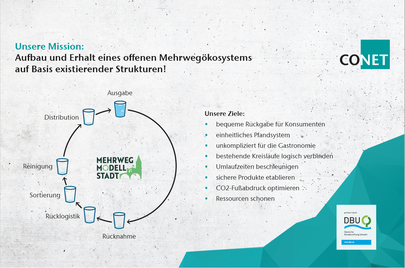 - Ein Konzept für die anbieterunabhängige Rückgabe von Mehrwegbechern in Betrieben und Rücknahmeautomaten im öffentlichen Raum auf dem ein lokales Netzwerk aus Mehrweg-anbietern, Lebensmittellogistikern, städtischen Betrieben und teilnehmenden Unternehmen mit ihren Filialen aufgebaut wurde. Insgesamt waren 11 Unternehmen mit 92 Ausgabe-/Rücknahmestellen in diesen Mehrwegkreislauf aktiv eingebunden.
