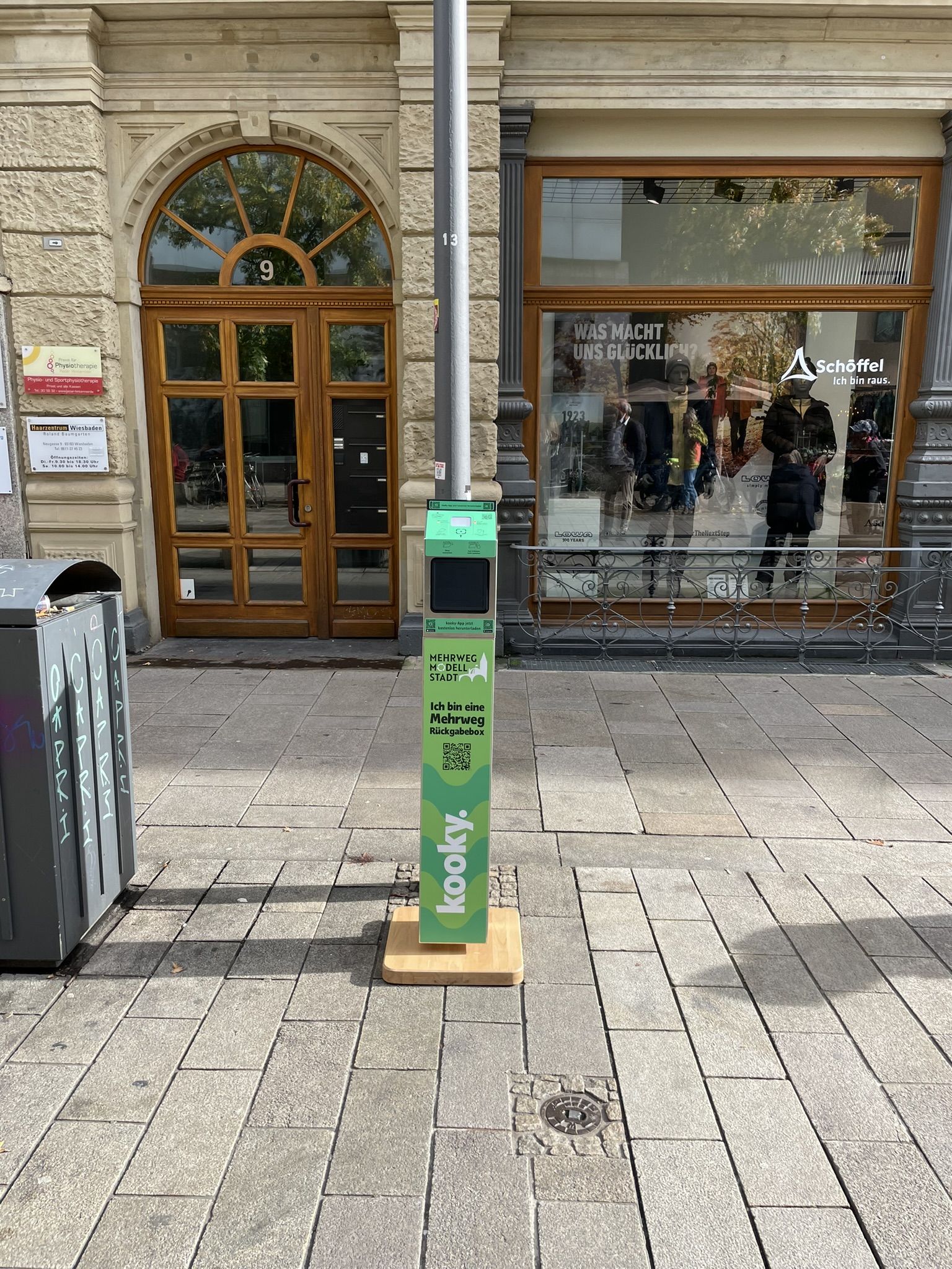 - Die Aufstellung und Erprobung von Rücknahmeautomaten im öffentlichen Raum durch die Adaption des Kooky2Go-Konzeptes aus den Städten Zürich und Bern. In diesem bundesweit ersten Projekt im öffentlichen Raum konnten Einblicke für die Verwaltung und Logistik gesammelt werden.