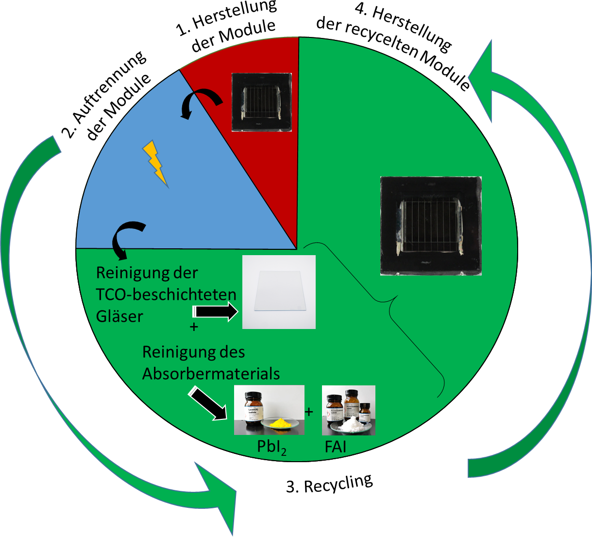 Die verkapselten Perowskit-Module sollen bei der Solar Materials GmbH mittels thermo-mechanischer Verfahren aufgetrennt werden. Getestet werden soll eine Auftrennung so, dass der Glas-Polymer-Verbund, und damit das Glas als Ganzes, effektiv vom Absorbermaterial getrennt wird. Somit soll im Gegensatz zum gängigen Schreddern keine Vermischung mit den anderen Materialien erfolgen. Das Glas kann daher erneut zu Flachglas verarbeitet werden. Das Perowskit-Absorbermaterial wird sortenrein eingesammelt und es muss lediglich 1/3000 der Gewichtsmenge eines Moduls chemisch aufbereitet werden.