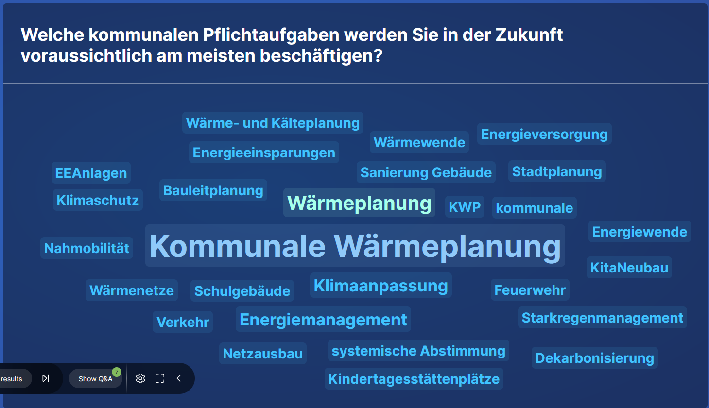 Der Maßnahmenkatalog wurde Ende des Jahres 2024 abgeschlossen. Zunächst wurden die Rechtsgrundlagen recherchiert. Im Folgeschritt wurden Energiewendemaßnahmen herausgesucht, welche sich mit Pflichtaufgaben kombinieren lassen. Zur Konkretisierung des Katalogs hat die AEE Interviews geführt. Aufbauend auf dem Maßnahmenkatalog hat die AEE eine Liste an Kommunen erstellt, in denen EE-Projekte im Rahmen kommunaler Pflichtaufgaben umgesetzt wurden. Diese Kommunen wurden in eine Online-Datenbank übertragen. Die Datenbank wurde im Februar 2025 veröffentlicht. Während der Projektlaufzeit hat die AEE die Ergebnisse auf insgesamt vier Workshops vorgestellt (3 online, 1 in Präsenz). Das Nachschlagewerk wurde Ende Oktober 2025 veröffentlicht. Das Interaktive Tool wurde im April 2025 fertiggestellt. Dieses Tool erläutert die Projektinhalte in kompakter und spielerischer Form. Im Zuge der Erarbeitung des Maßnahmenkatalogs ließ sich feststellen, dass es keine abschließende Auflistung kommunaler Pflichtaufgaben gibt. Zudem unterscheiden sich die Pflichtaufgaben ja nach Bundesland. Die Übersicht enthält also keine abschließende Liste an Pflichtaufgaben, sondern bietet einen Ausschnitt an Möglichkeiten zur Kombination von Pflichtaufgaben und Energiewendeprojekten.
