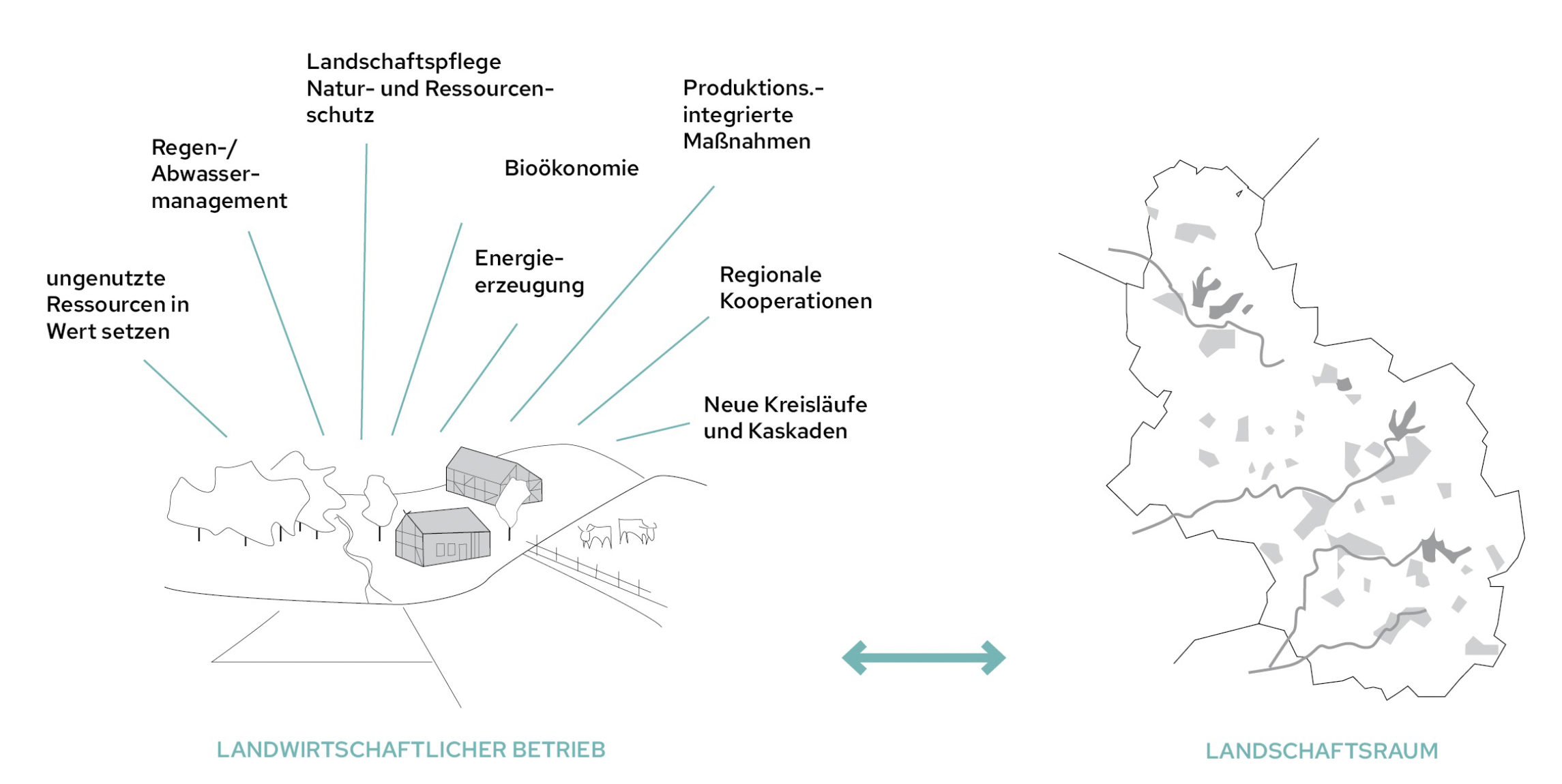 Die landwirtschaftliche Perspektive auf Betriebsebene wird konsequent in Zusammenhang mit der landschaftlichen Perspektive als regionaler Landschaftsraum gedacht. Mit Blick auf die vielschichtigen und systemischen Wechselwirkungen von Landwirtschaft auf der Maßstabsebene des einzelnen Betriebs und Landschaftsfunktionen auf regionaler Ebene soll ein Diskurs über den Landschaftswandel, seine Steuerung, den Wert der Landschaft sowie der Rolle der Landwirtschaft in diesem Prozess geführt werden.