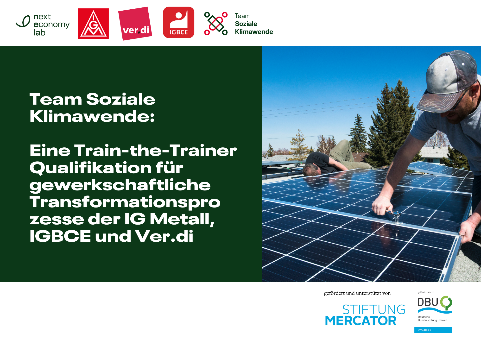 Kern bildet eine Train-the-Trainer Qualifikation, in Zusammenarbeit mit ver.di, IG Metall und IGBCE, bei der Gewerkschafter*innen in Betrieben ausgebildet werden Multiplikator*innen der sozial-ökologischen Transformation zu werden. Durch die fundierte Vermittlung von Wissen, Organisations- und Kommunikationsfähigkeiten werden Teilnehmer*innen befähigt, Projekte mit Breitenwirksamkeit durchzuführen, und ihrerseits weitere Personen auszubilden. So wird langfristig das Multiplikationspotential erhöht und ein Schneeballeffekt innerhalb und durch Vernetzung mit anderen ausgebildeten Multiplikatoren auch übergewerkschaftlich erzeugt.