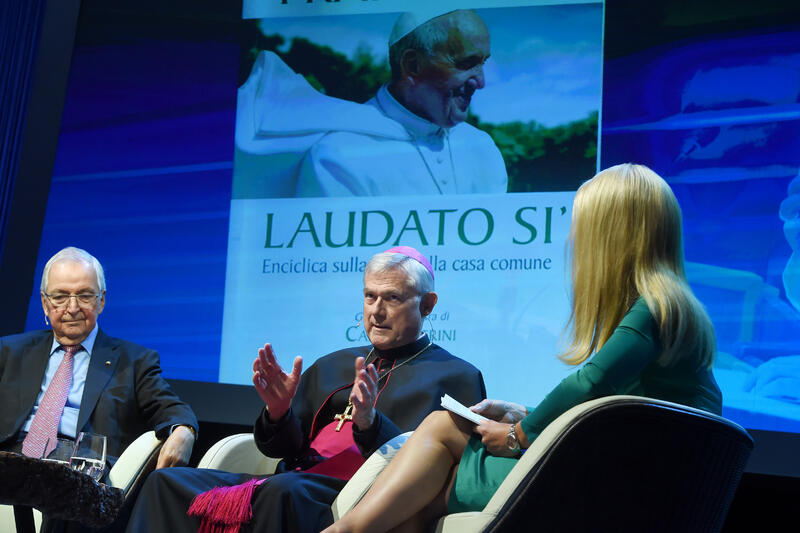Dr. Bernd Uhl, Weihbischof in der Erzdiözese Freiburg (Mitte) im Gespräch mit Prof. Klaus Töpfer (links) und Judith Rakers (rechts) während des Deutschen Umweltpreises 2016 in Würzburg.