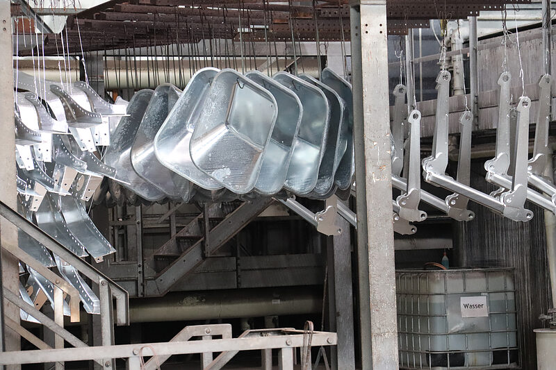 Verzinkte Kippmulden von Schubkarren und andere verzinkte Stahlteile hängen in einer Halle im Stahlverzinkungsbetrieb ZINQ am Standort Hagen